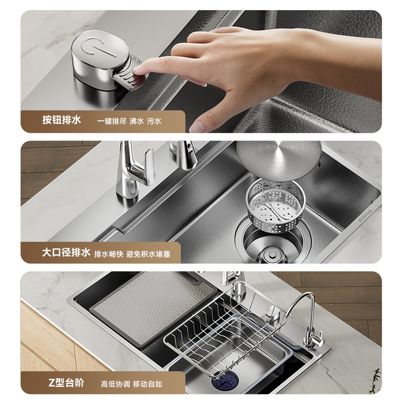 JDAO杰岛A6厨房家用316L不锈钢水槽,采用优质316L医用级不锈钢材质,耐腐蚀、抗生锈,安全健康。加厚设计增强承重与静音效果,无涂层工艺避免脱落隐患,持久耐用。76×48cm大单槽设计,空间宽敞,轻松容纳锅碗瓢盆,提升清洗效率。表面细腻拉丝工艺,防刮易洁,持久如新。配备高效下水系统,排水迅速不堵塞。适用于多种安装方式,适配各类厨房风格。JDAO杰岛A6水槽以卓越品质与人性化设计,为现代家庭厨房带来便捷、卫生、耐用的洗涤体验,是追求高品质生活的理想选择。
