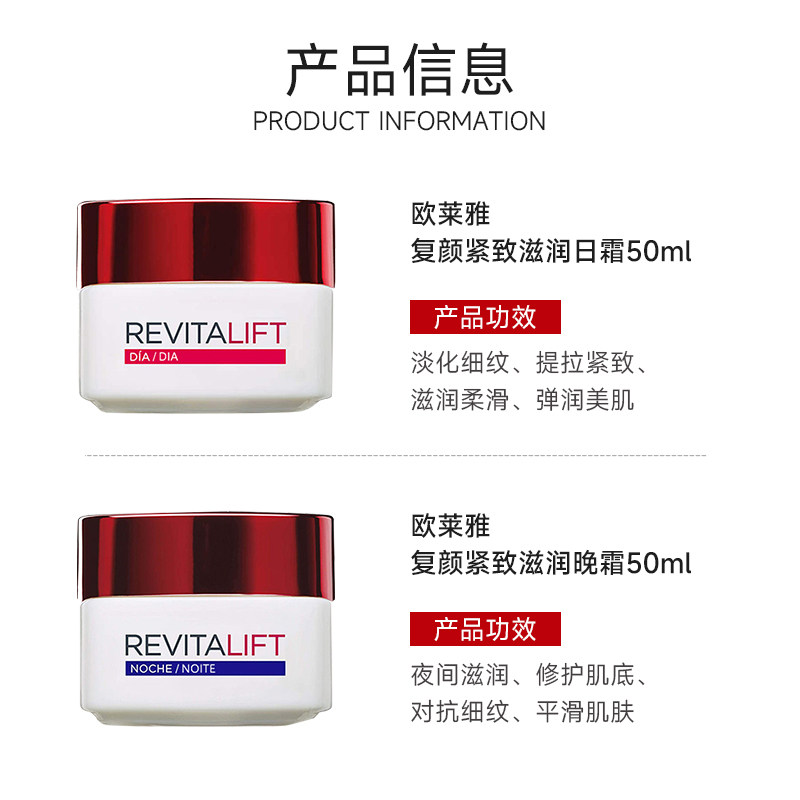 【2瓶装】欧莱雅复颜面霜大红瓶,日霜与晚霜双重呵护,专为抗皱紧致设计。富含视黄醇Pro+成分,有效促进胶原蛋白生成,淡化细纹,提升肌肤弹性。高保湿配方深层滋养,改善干燥粗糙,令肌肤饱满柔滑。日霜轻盈防护,抵御日间环境侵害;晚霜密集修护,加速夜间肌肤再生。双重搭配,24小时持续抗老,适合轻熟龄至熟龄肌肤使用。经典大红瓶包装,质地丰润易吸收,温和不刺激,经皮肤科测试,敏感肌亦可安心使用。坚持使用,重现紧致弹润的年轻光采。