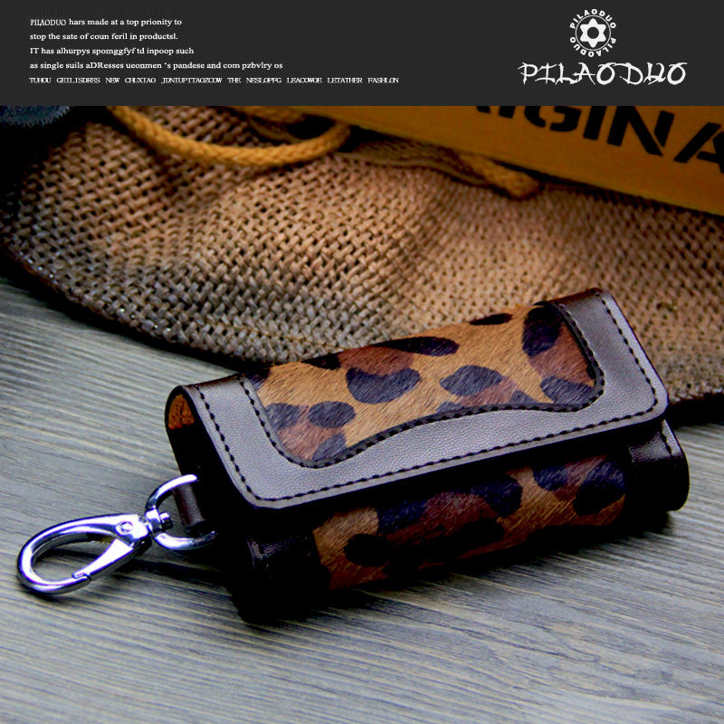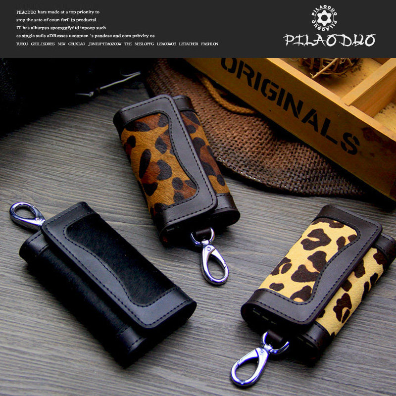 天猫pilaoduo新款牛皮加马毛钥匙包豹纹女式女士车钥匙包牛皮钥匙扣