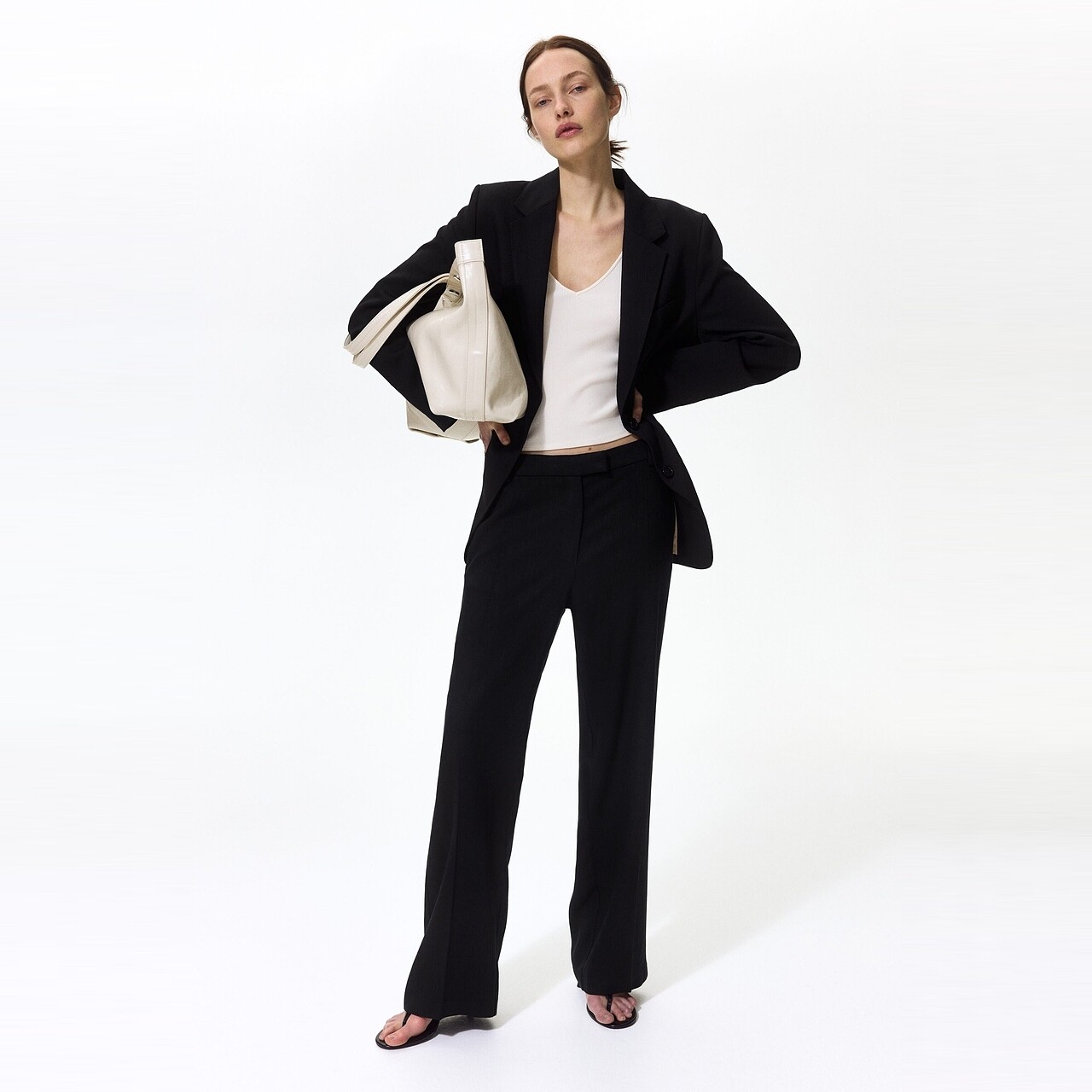 HM 2026春季新款女装亚麻混纺西裤(货号:1322837)以轻盈透气的亚麻混纺面料打造,融合自然质感与现代剪裁,兼顾舒适与优雅。高腰设计搭配微阔直筒版型,巧妙修饰腿型,展现利落线条。腰部采用隐形拉链与纽扣闭合,细节精致,侧边插袋兼顾实用与美观。柔和的米白、浅卡其等春季色调,轻松搭配衬衫、针织衫或西装外套,适合通勤、休闲等多种场合。环保染制工艺更添可持续理念,是春日衣橱的理想之选,诠释简约而不简单的都市女性风范。