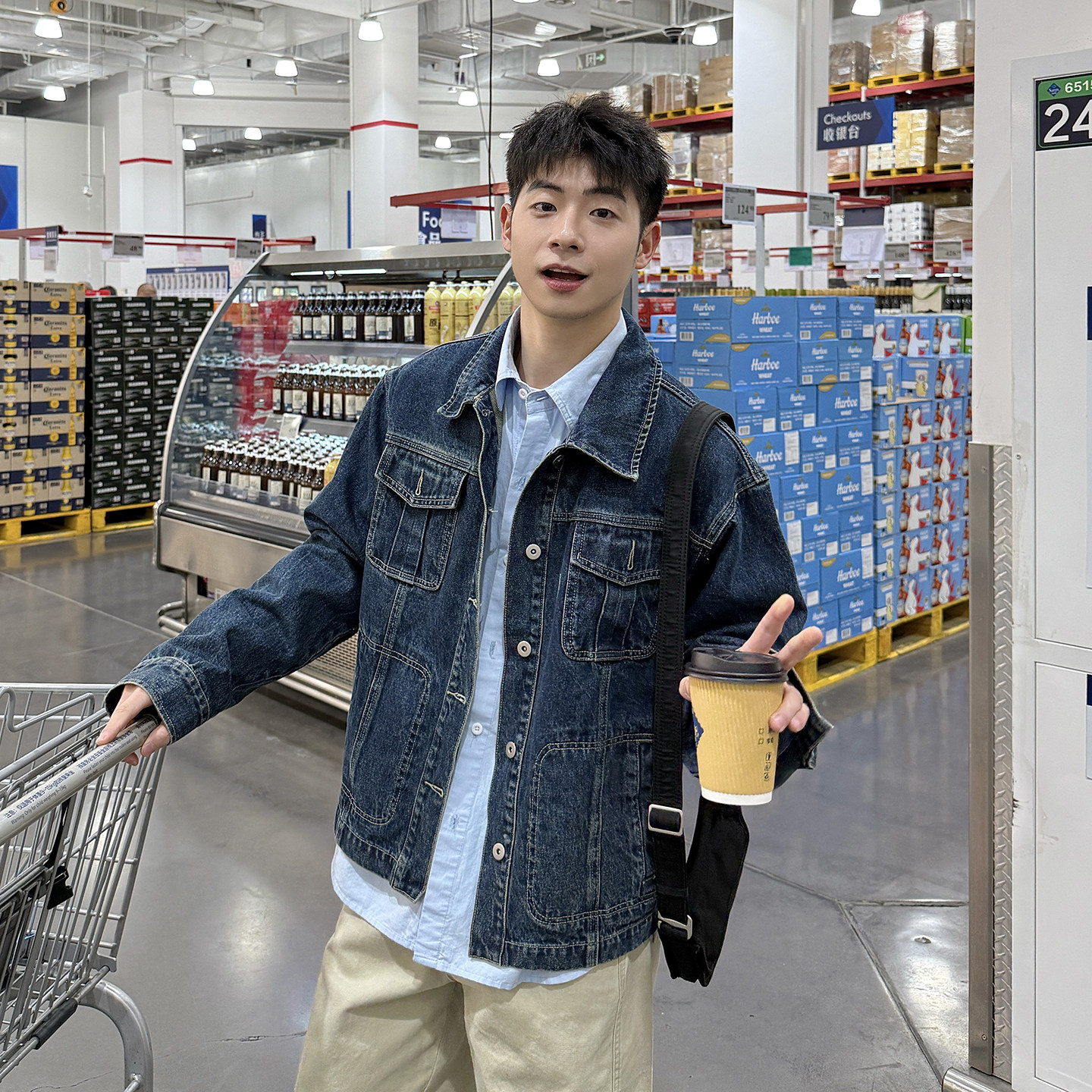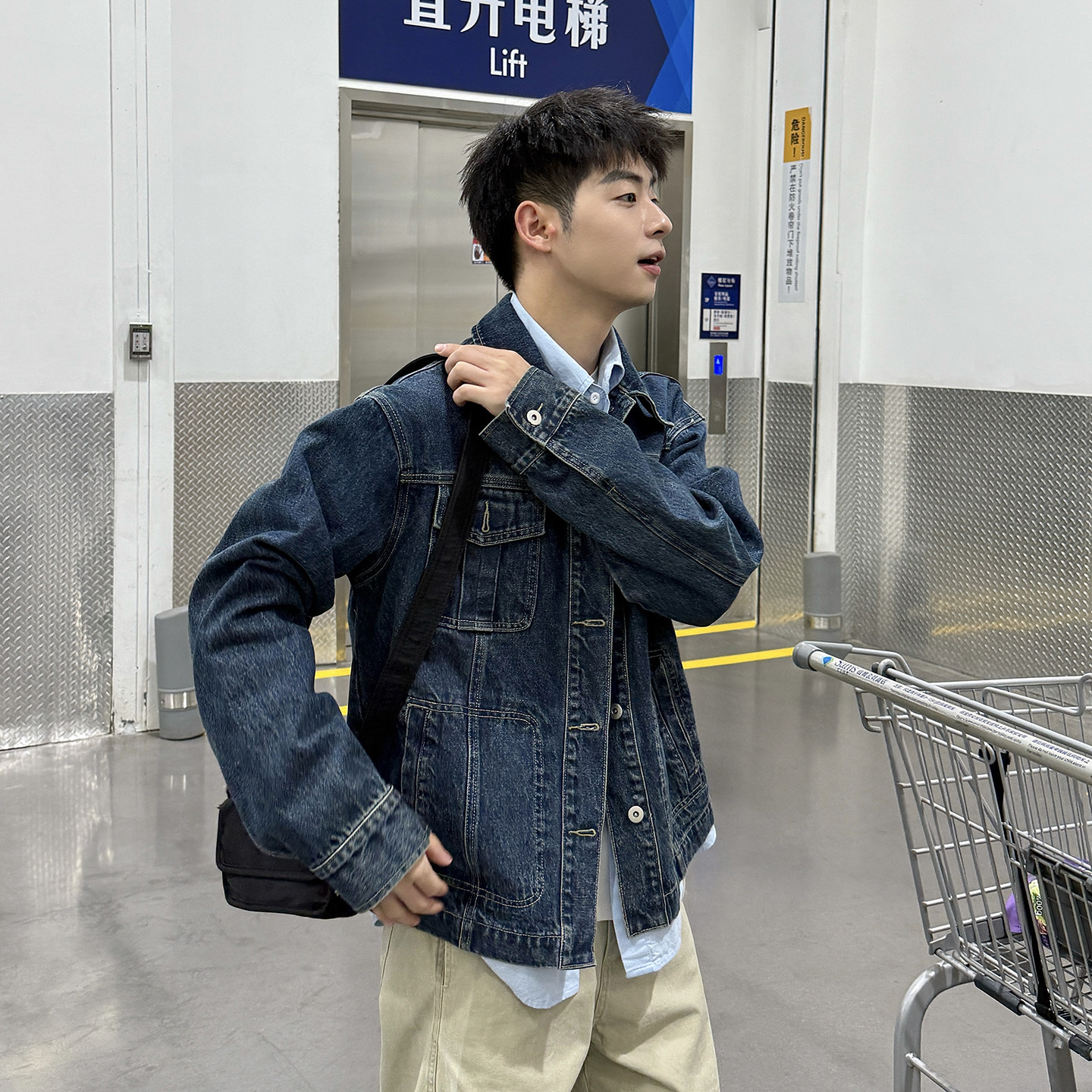 淘宝暗物质蓝色翻领纽扣牛仔外套男生春季新款宽松复古工装风夹克男