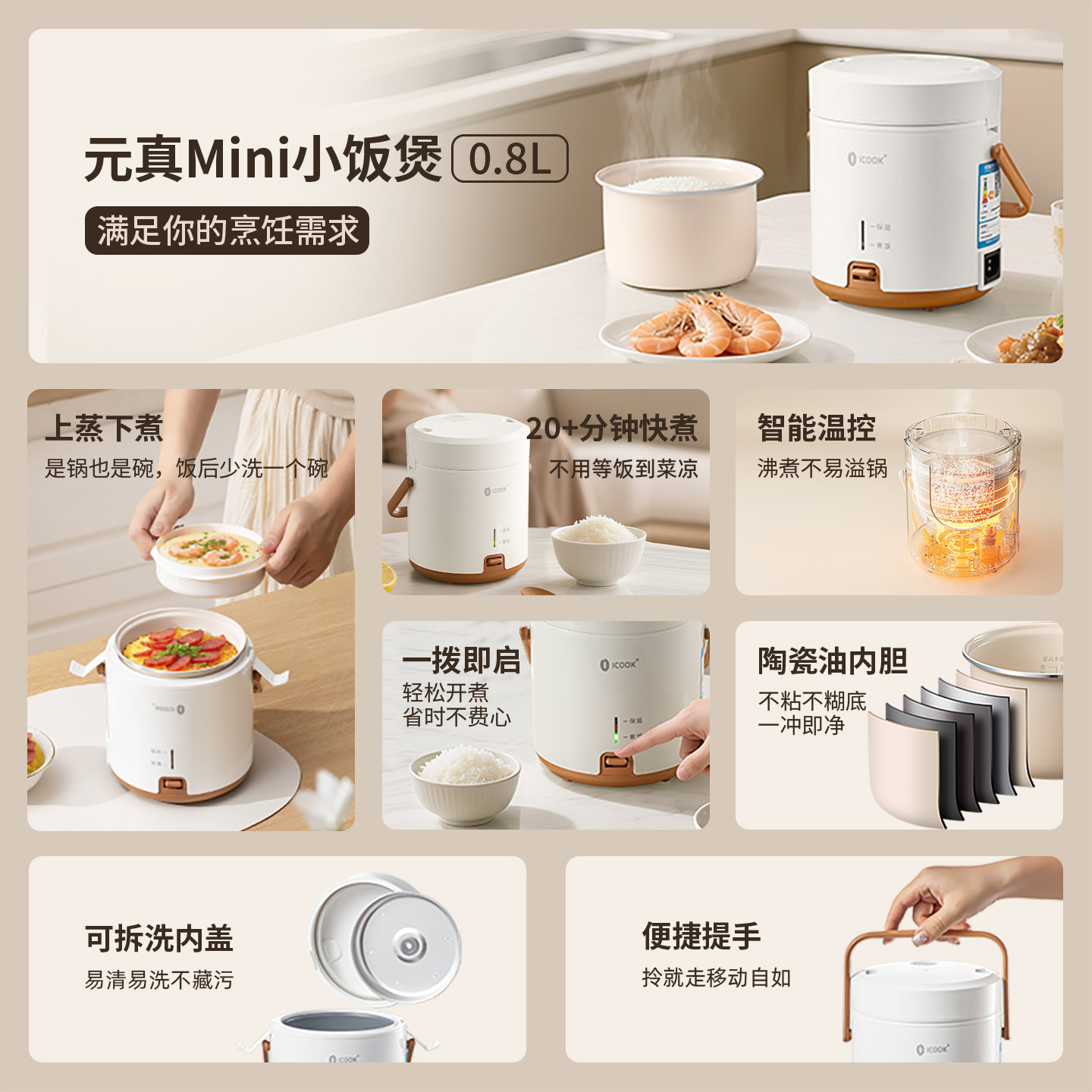 这款0.8L迷你电饭煲专为一人食设计,体积小巧,不占空间,非常适合宿舍、出租屋或办公室使用。精准控温技术确保米饭松软香甜,同时支持煮粥、煲汤、蒸蛋等多种功能,满足日常饮食需求。内胆采用不粘涂层,清洗方便,安全耐用。配备简约操作面板,一键启动,老人小孩也能轻松上手。低功耗设计节能环保,即使小空间也能享受热腾腾的家常美味。无论是学生、上班族还是独居人士,这款单人电饭锅都是理想选择,让一人食也能精致又营养。