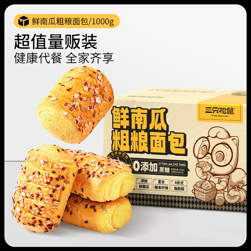 天猫三只松鼠_鲜南瓜粗粮面包1kg营养早餐0蔗糖手撕零食品糕点心饱腹