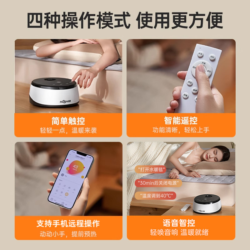 环鼎智能恒温水暖电热毯2026新款,创新采用水循环加热技术,告别传统电热丝,安全无辐射,体感更舒适。内置高精度温控系统,支持多档调温与智能恒温,有效避免过热干燥。毯体轻薄柔软,支持分区控温,满足双人不同需求。全新升级接入米家APP,支持远程操控、定时开关、温度自定义及语音控制(兼容小爱同学),让温暖触手可及。水电分离设计,通过多项安全认证,使用更安心。低噪音运行,伴您整夜安眠。2026款环鼎水暖电热毯,科技与暖意兼具,重新定义智能睡眠体验。