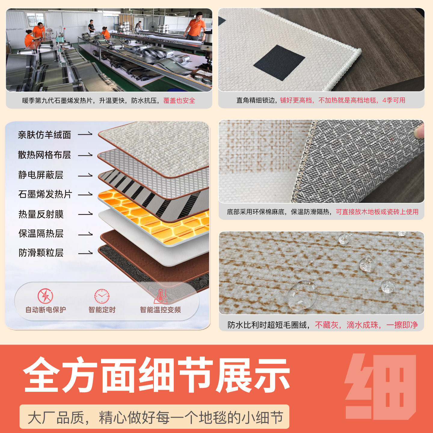 这款暖季石墨烯加热地毯专为客厅家用设计,融合先进石墨烯发热技术,升温迅速且均匀,节能环保,安全耐用。采用比利时进口圈绒面料,触感柔软舒适,防水防污,日常清洁更省心。底部防滑设计稳固贴合地面,使用更安全。支持多档温控调节,满足不同季节与体感需求。可拆卸电源线设计,支持机洗或手洗,轻松保持洁净。无论是寒冬取暖,还是日常休闲,这款电热地毯都能为您带来温暖惬意的居家体验,是现代家庭提升生活品质的贴心之选。