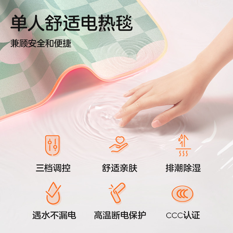 彩虹电热毯单人调温电褥子,专为学生宿舍、家用及美容床设计,安全舒适,品质信赖。采用优质面料,柔软亲肤,支持多档调温,满足不同季节与个人需求。内置过热保护系统,使用更安心。低功率设计,节能省电,适合长时间使用。尺寸适配标准单人床,折叠便携,收纳方便。作为彩虹官方旗舰店正品,享受完善售后保障。无论是寒冷冬夜还是美容护理时的恒温需求,这款电热毯都能提供温暖呵护,是学生、上班族及美容行业人士的贴心之选。安全、实用、耐用,让温暖触手可及。
