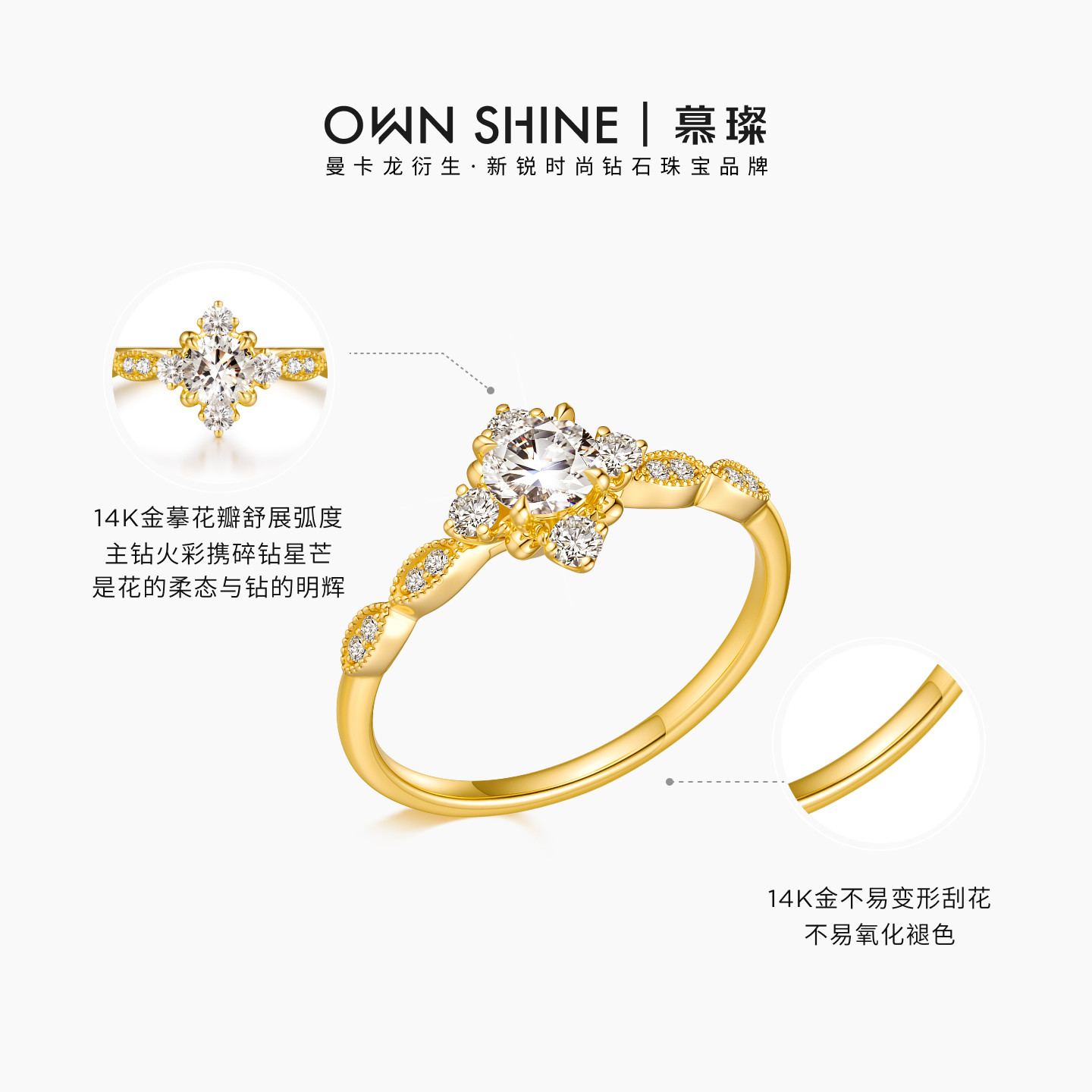 【38节礼物推荐】曼卡龙/慕璨14K金月汀暮光培育钻戒指,以独特设计诠释现代女性的优雅与独立。灵感源自暮色中静谧的月光,戒圈采用14K金打造,线条流畅,质感温润。主石甄选高品质培育钻石,璀璨闪耀却不失环保理念,呼应可持续时尚潮流。戒臂镶嵌细密小钻,如星河环绕,细节精致考究。整体造型简约而不失设计感,小众独特,避免撞款尴尬。无论是日常佩戴还是重要场合,都能凸显佩戴者的品味与格调。作为三八节礼物,它不仅是一份心意,更象征着对自我价值的珍视与赞美,是送给母亲、伴侣或自己的理想之选。