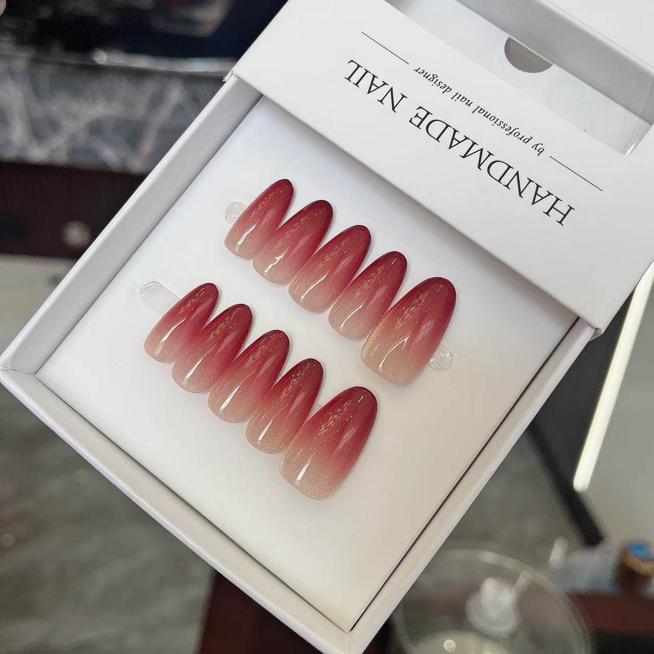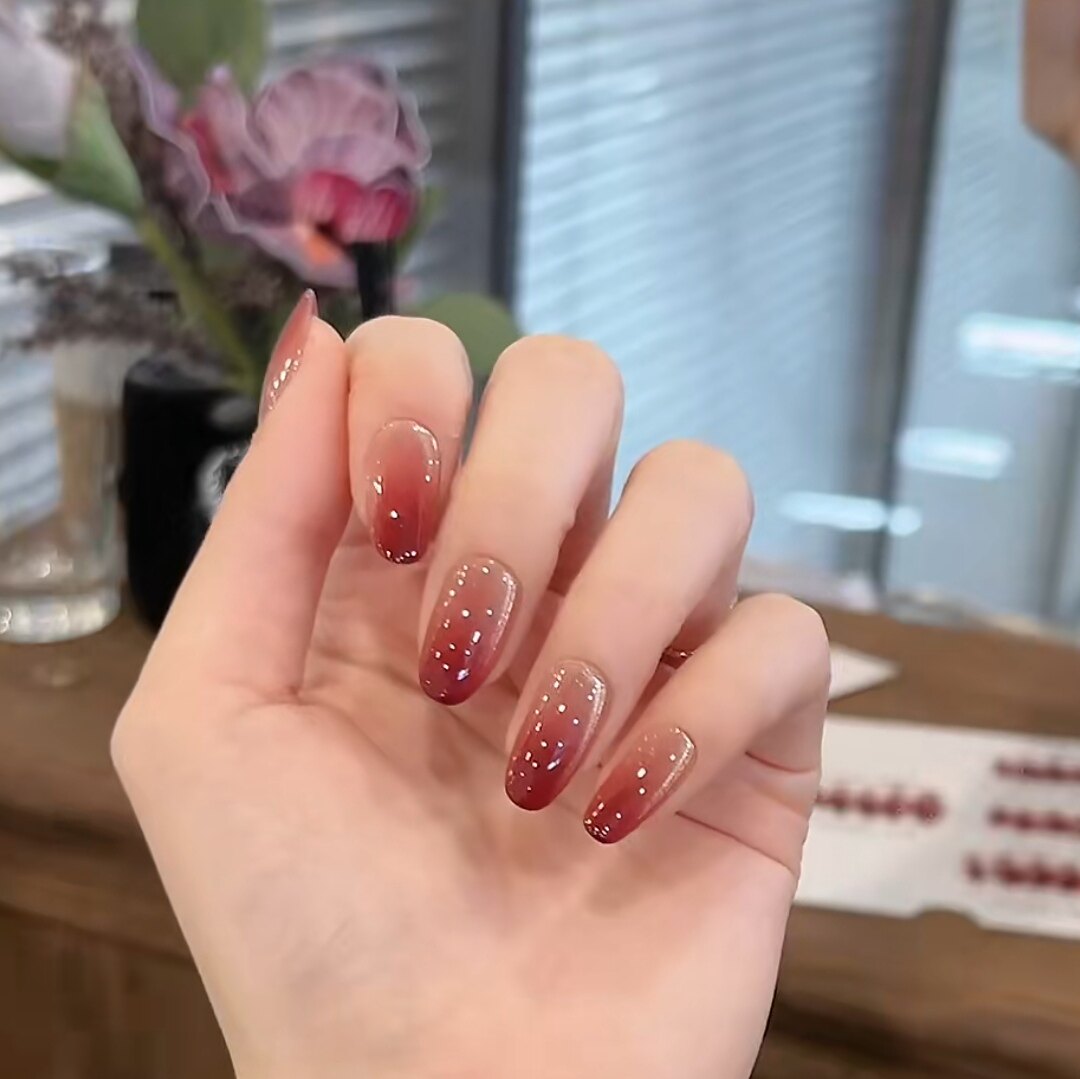淘宝【酒渍红茶】显白气质纯欲渐变猫眼穿戴甲中椭圆ins 风美甲短椭圆