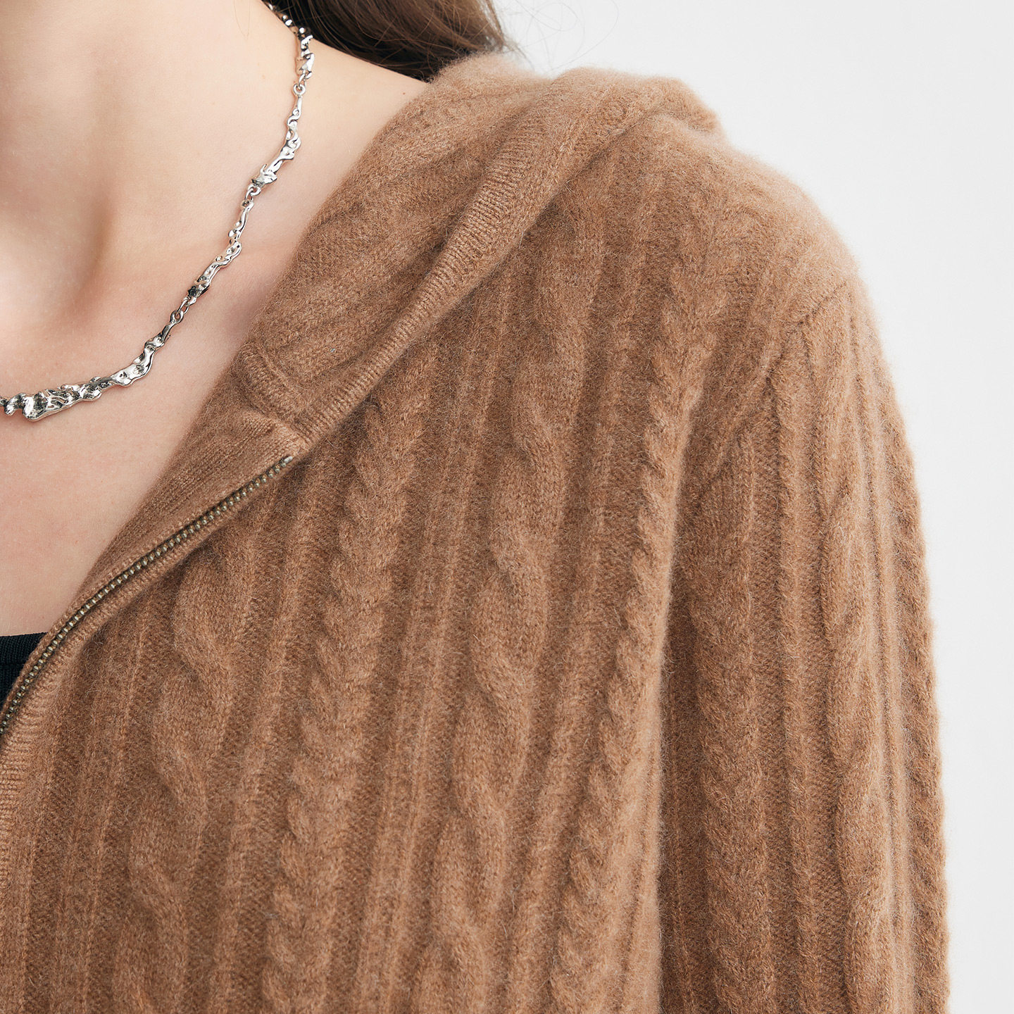 天猫PALUOPO/帕罗老钱风绞花连帽纯山羊绒开衫女针织衫气质毛衣外套