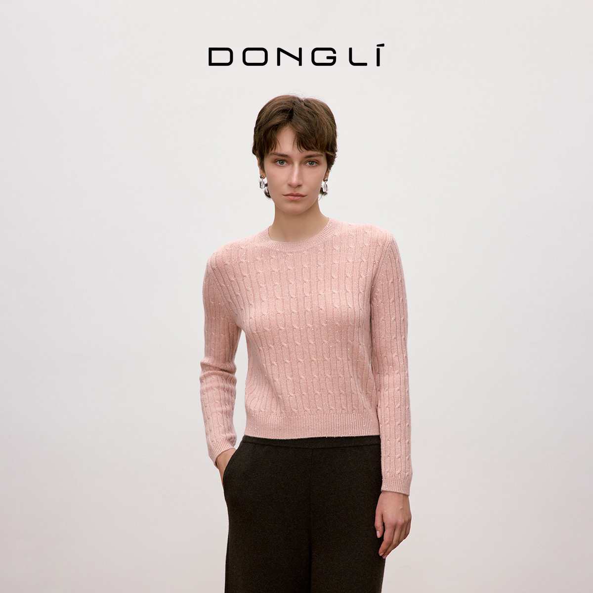 东黎山羊绒女士秋冬圆领绞花珠片针织套衫(款号4A97)精选优质山羊绒材质,触感柔软细腻,保暖性极佳,适合秋冬季节穿着。宽松版型设计,包容性强,轻松遮肉,穿着舒适自在。经典圆领搭配精致绞花纹理,增添复古优雅气息,袖口与衣身点缀细腻珠片,在光线下闪耀动人,提升整体时尚感。长袖设计有效抵御寒风,兼具温度与风度。无论是搭配大衣、半身裙还是裤装,都能轻松打造温婉知性或慵懒随性的穿搭风格,是都市女性秋冬衣橱的必备单品,展现低调奢华的质感魅力。