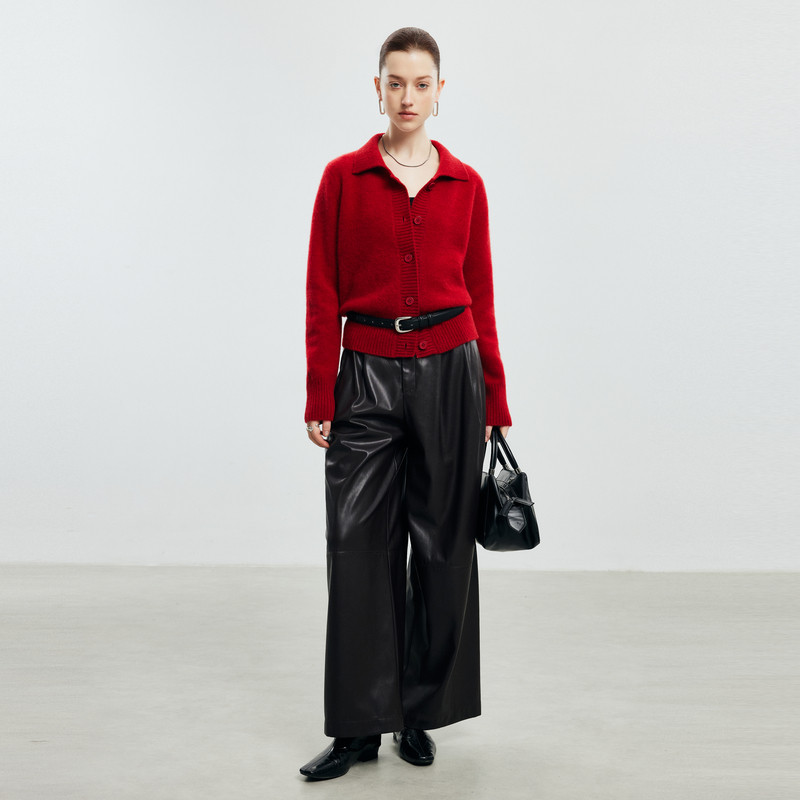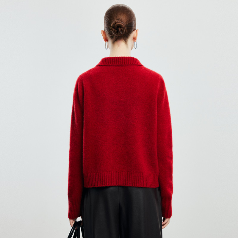 PALUOPO/帕罗极简风红色立领拉链针织开衫女长袖羊绒衫显瘦上衣
