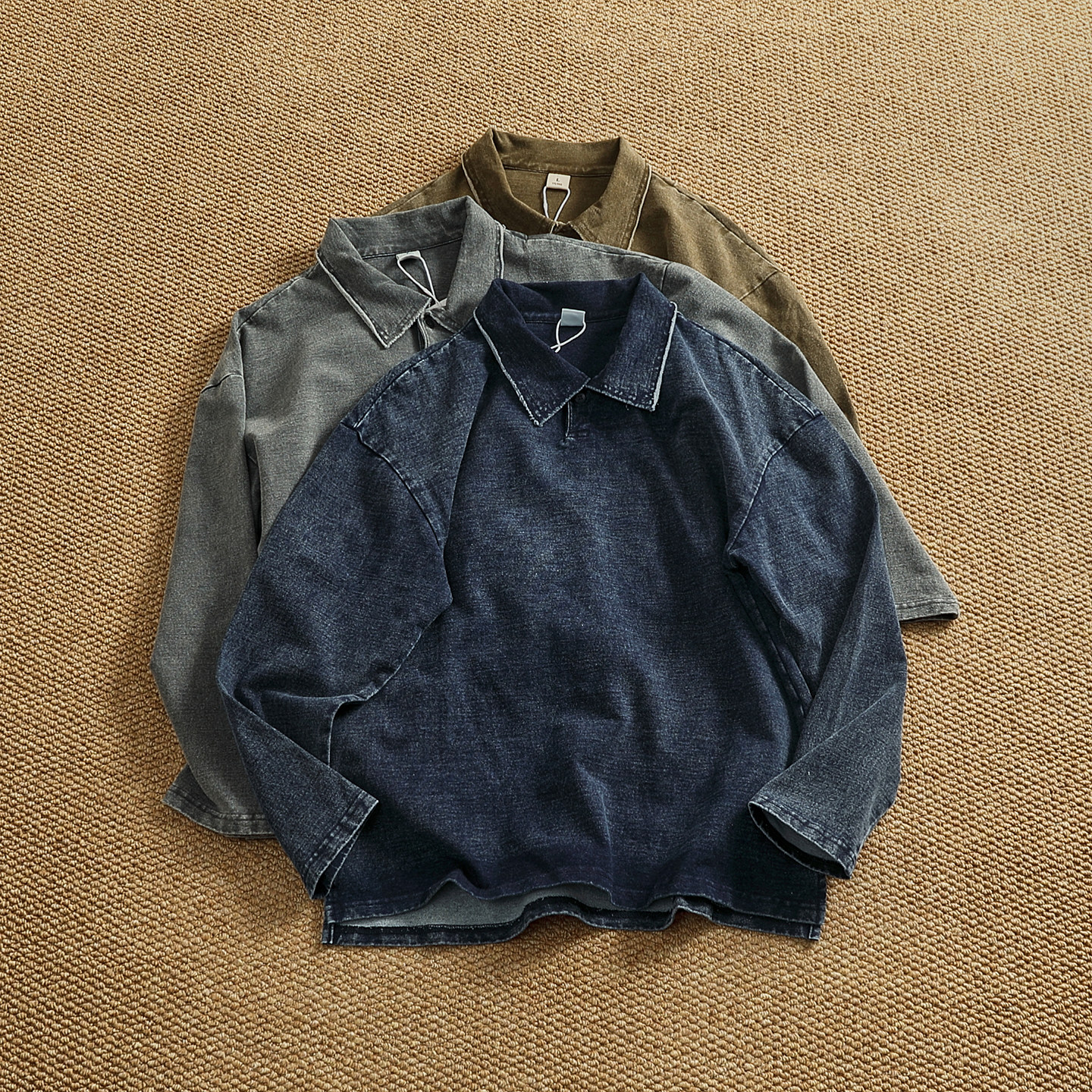 淘宝重工水洗复古做旧针织牛仔POLO衫男时尚潮款宽松休闲翻领长袖卫衣
