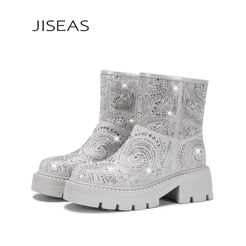 天猫JISEAS璀璨星空水钻雪地靴女2025新款冬季真皮东北防滑加厚保暖靴