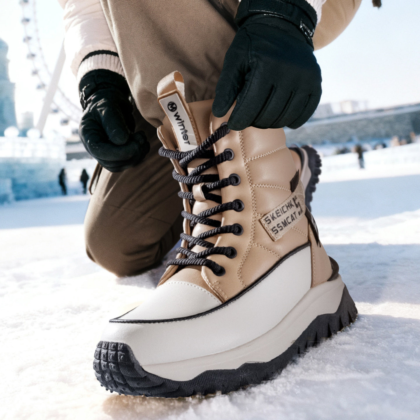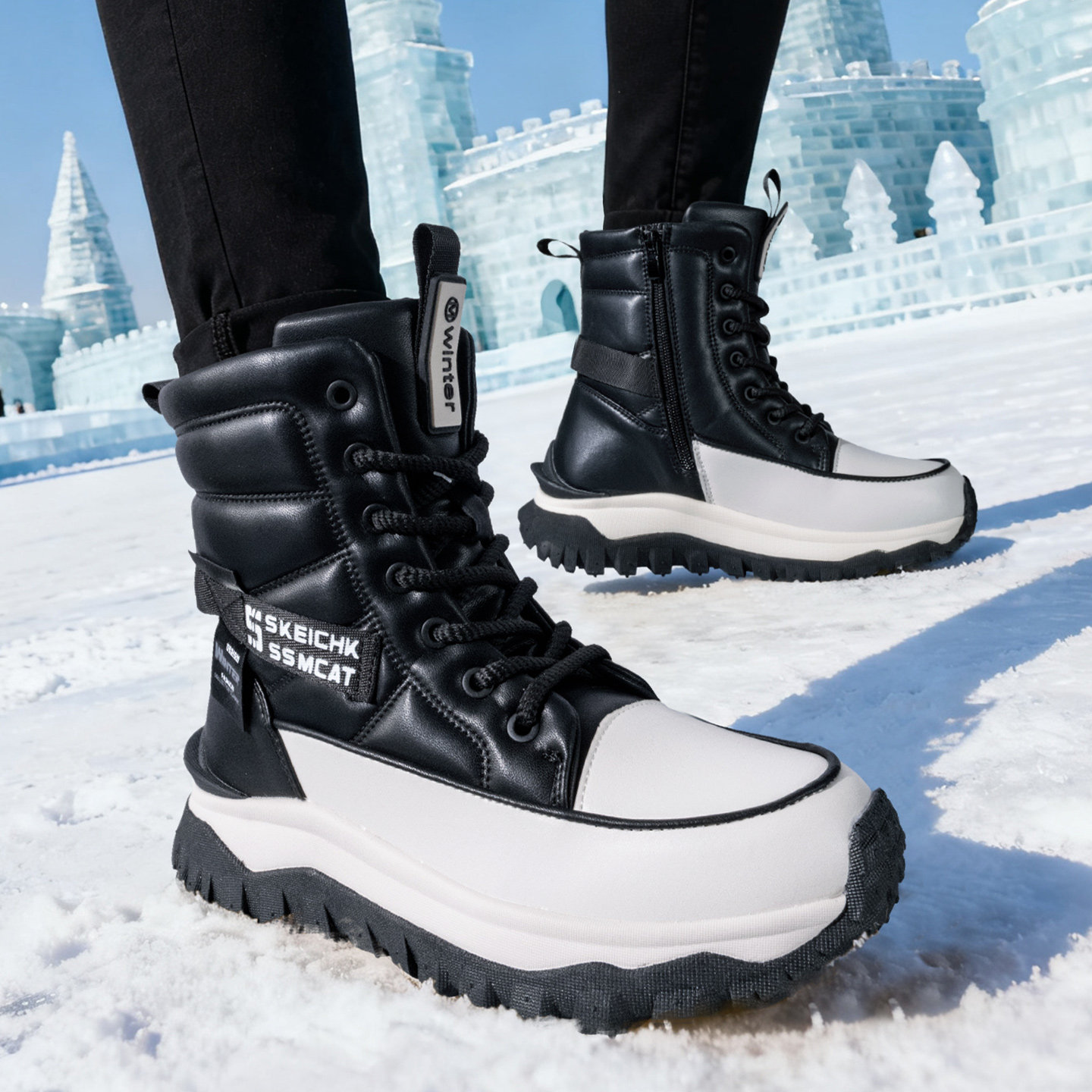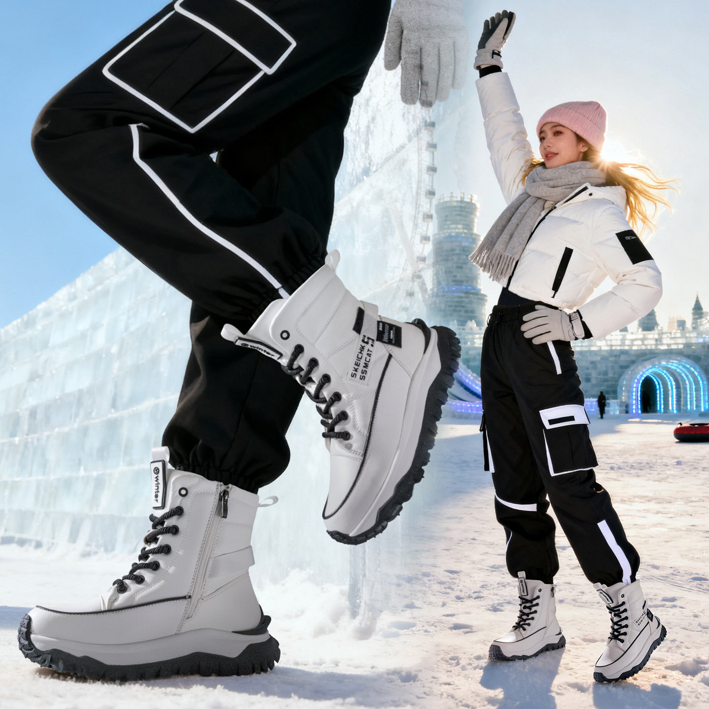 这款东北女款雪地靴是冬季防寒保暖的理想选择,专为严寒气候设计。采用高品质防水面料,有效抵御雪水渗透,保持双脚干爽舒适。内里填充优质保暖棉,锁温性能卓越,即使在零下低温也能温暖如春。防滑耐磨橡胶大底,深纹路设计增强抓地力,冰雪路面行走更安全。厚底造型不仅提升保暖效果,还增添时尚感,轻松搭配羽绒服、大衣等冬装。鞋口加高设计,防风护踝,全方位抵御寒风侵袭。轻便耐穿,舒适贴合脚型,是冬季出行、户外活动的必备单品,兼顾实用性与潮流美感,让美丽不惧严寒。