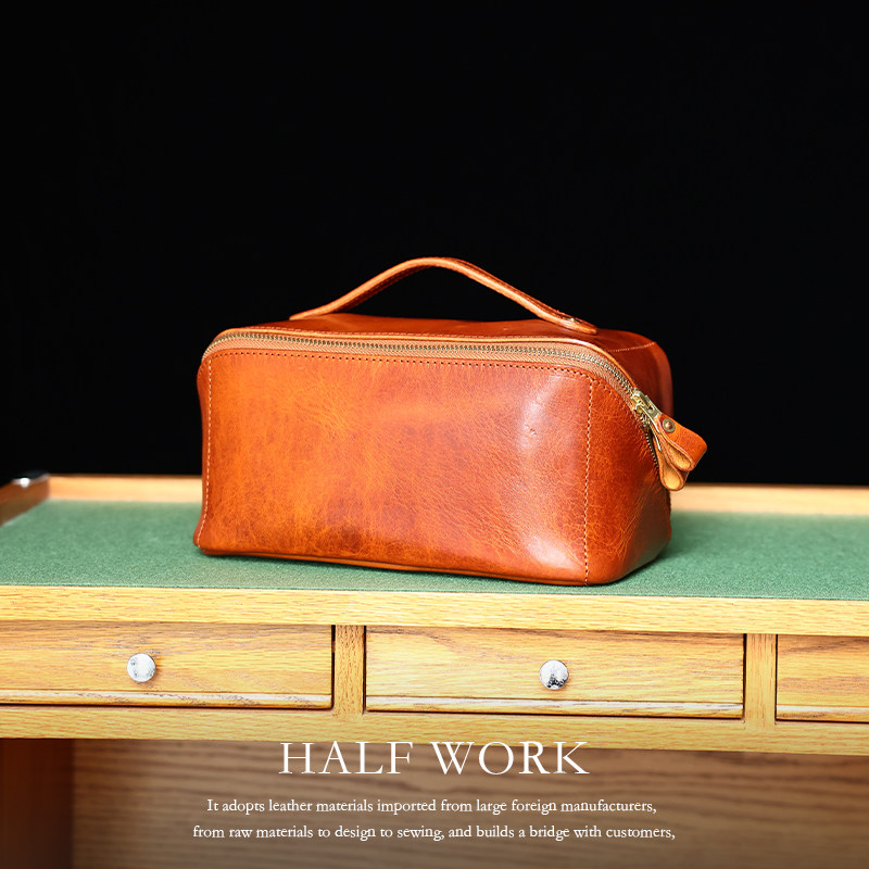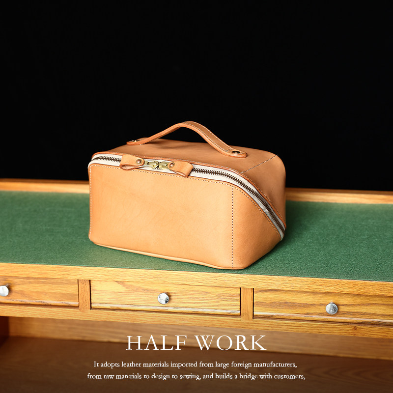 HALFWORK头层牛皮化妆包,精选优质头层牛皮打造,质感细腻,触感温润,彰显复古优雅气质。采用纯手工缝制工艺,针脚均匀紧密,耐用不易脱线。大容量设计,分层收纳合理,可轻松容纳化妆品、护肤品及洗漱用品,满足日常出行与旅行需求。便携式手提设计,轻便易携,拉链顺滑开合,使用便捷。简约复古外观搭配金属配件,兼具实用性与时尚感,是都市女性通勤、差旅的理想伴侣。真皮材质历久弥新,随使用时间沉淀独特光泽,展现个性品味。