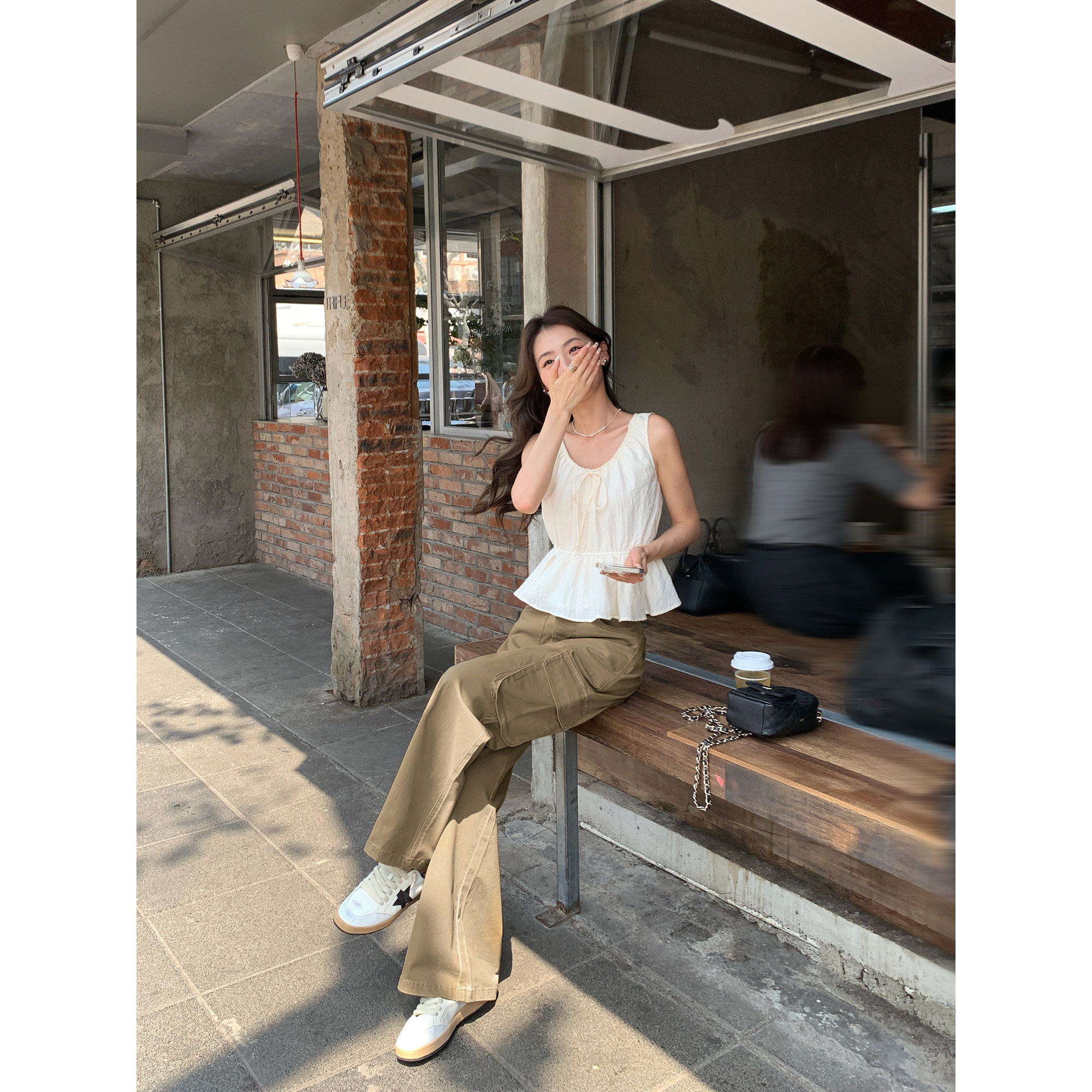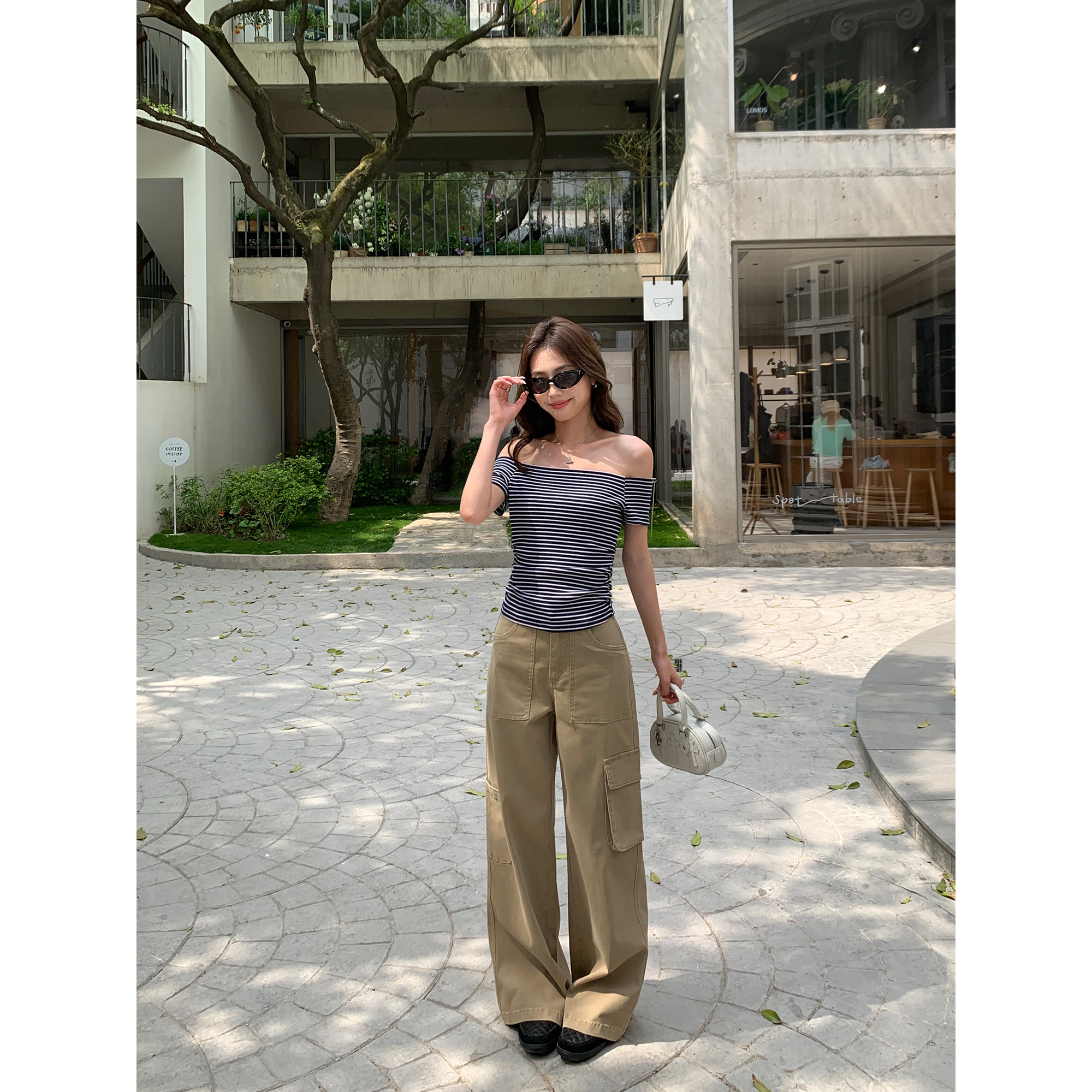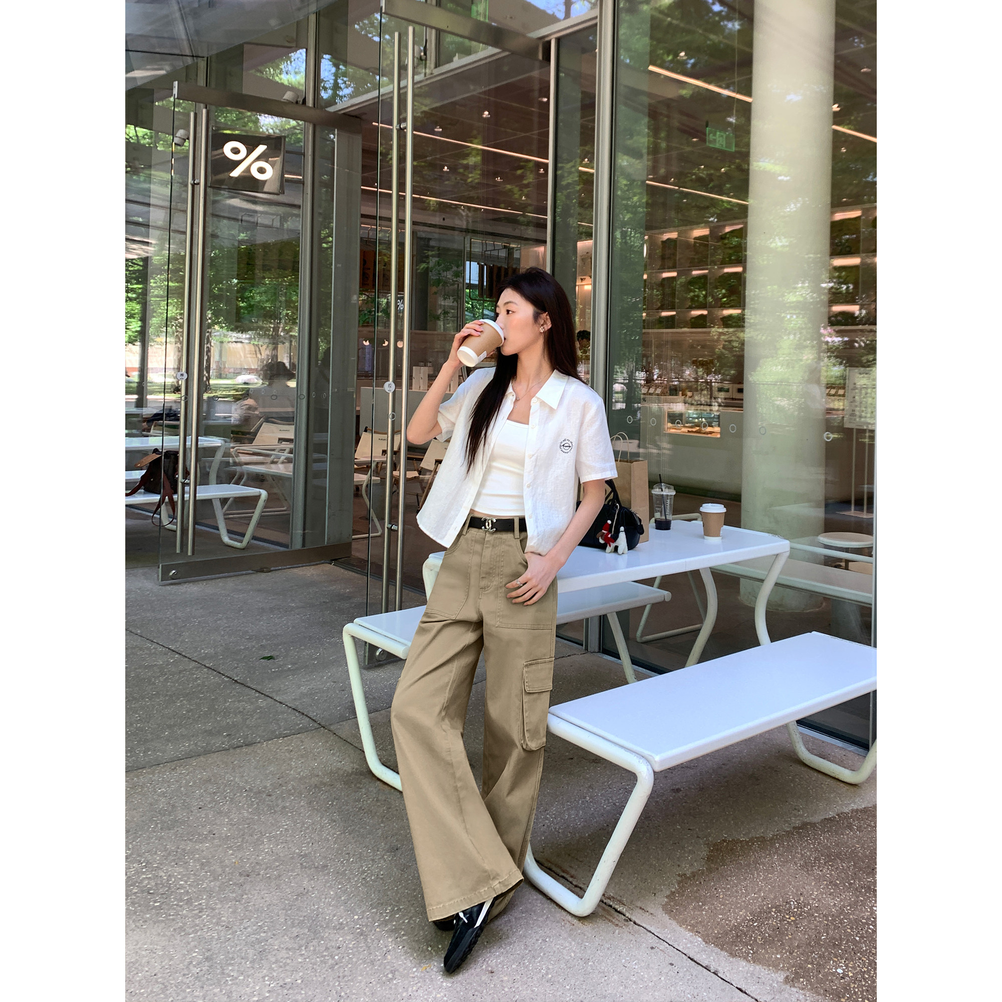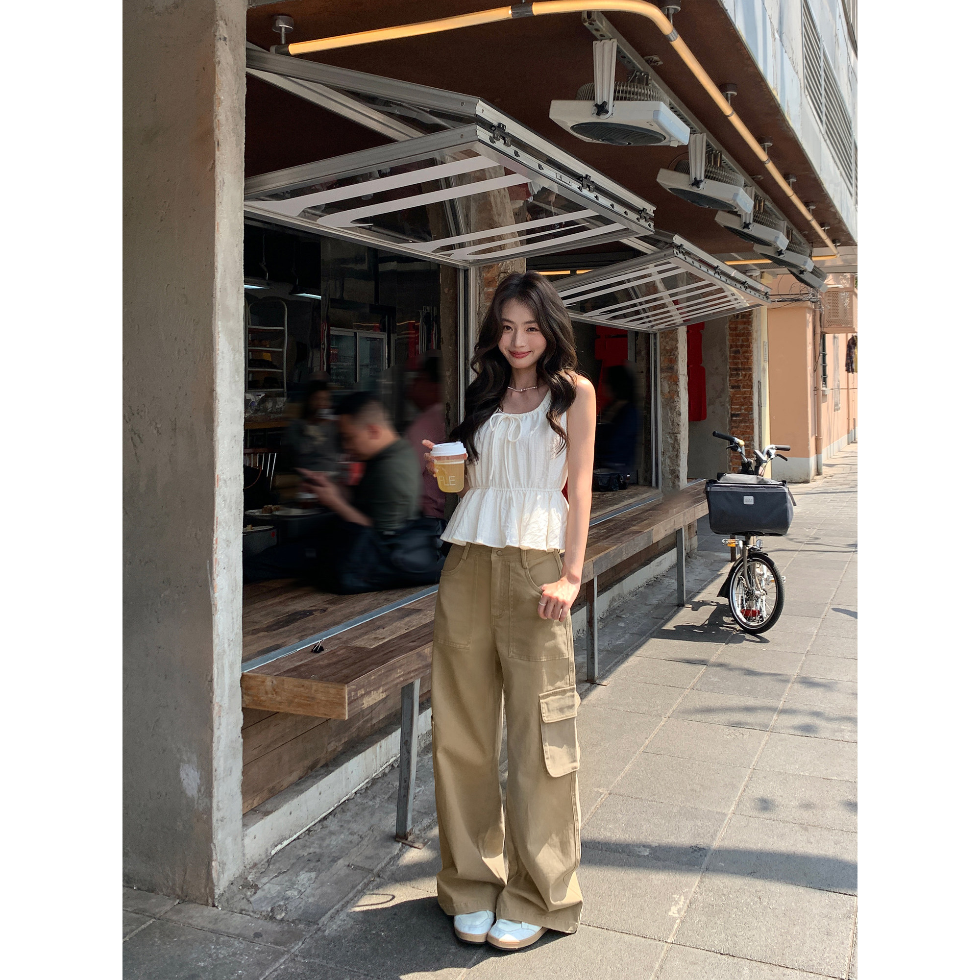 淘宝pusumede多口袋卡其色工装牛仔裤女宽松直筒阔腿裤高腰休闲裤长裤