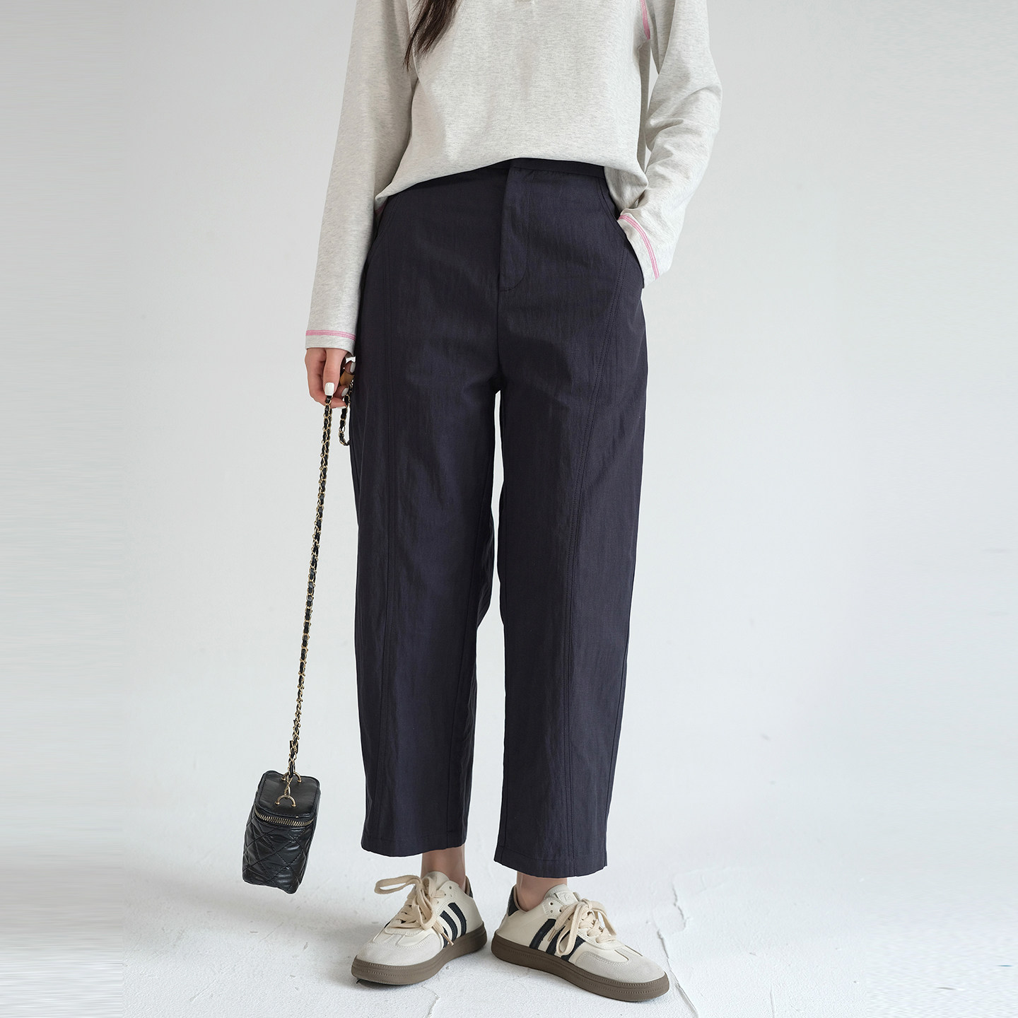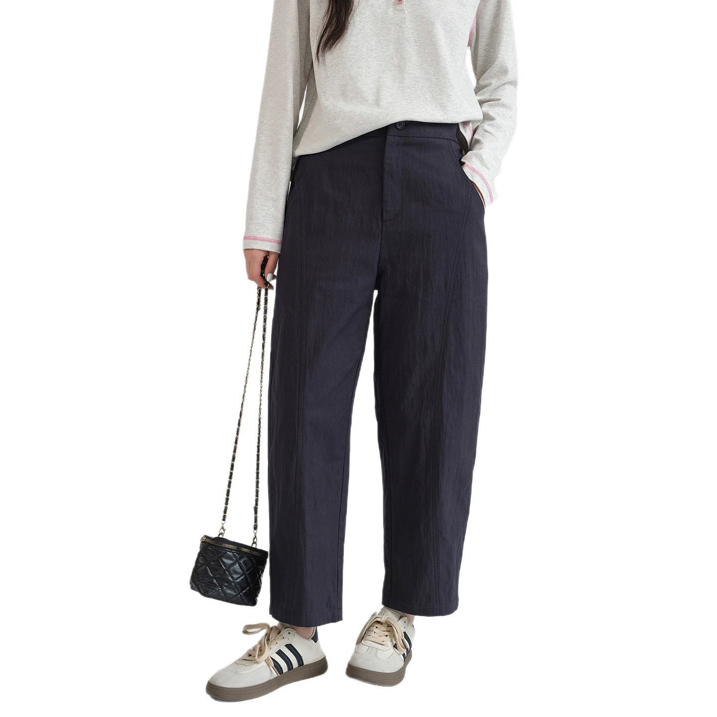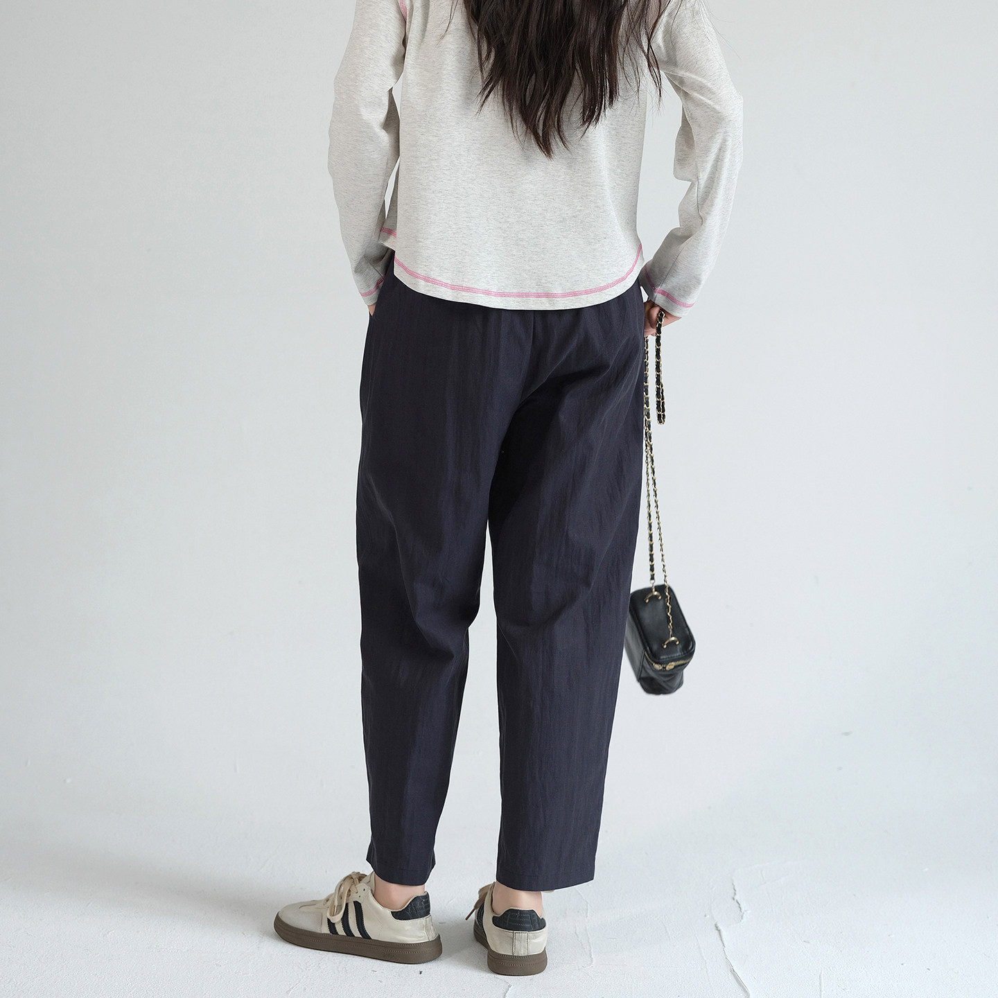 蓝若水大码女装2026春装新款莱赛尔高腰萝卜裤,专为胖MM设计,兼顾舒适与时尚。精选优质莱赛尔面料,亲肤透气,垂感佳,穿着轻盈自在。高腰设计有效收腹提臀,视觉拉长腿部线条;直筒哈伦版型巧妙修饰腿型,遮肉显瘦,轻松驾驭各种身材。萝卜裤型上宽下窄,搭配灵活,无论是搭配针织衫还是短外套,都能展现优雅气质。多色可选,适合日常通勤、休闲出行等多种场合。蓝若水以匠心工艺打造大码女性专属美,让每一位女性穿出自信与魅力。