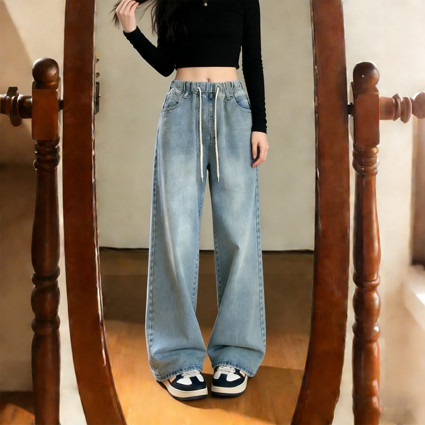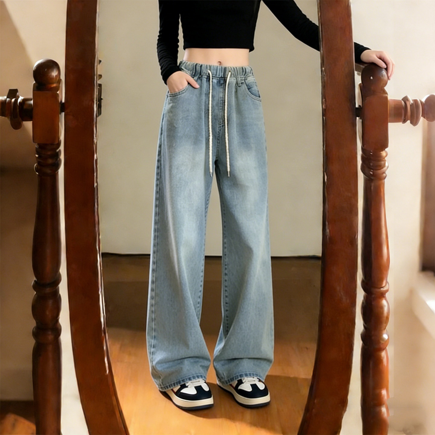 这款大码女装专为梨型身材的胖MM量身打造,采用高腰设计有效拉长腿部线条,视觉显瘦效果出众。宽松直筒阔腿版型包容性强,巧妙遮掩臀腿赘肉,搭配慵懒系带元素,随性中透露时尚感。精选垂坠感佳的高弹牛仔面料,舒适不紧绷,行走间自在飘逸。拖地长度设计不仅显高显瘦,更添几分潮流气息。无论是日常出街还是休闲聚会,都能轻松驾驭,展现自信优雅气质。整体剪裁兼顾舒适度与时尚感,是微胖女生衣橱里的必备单品,轻松穿出慵懒 chic 风格。