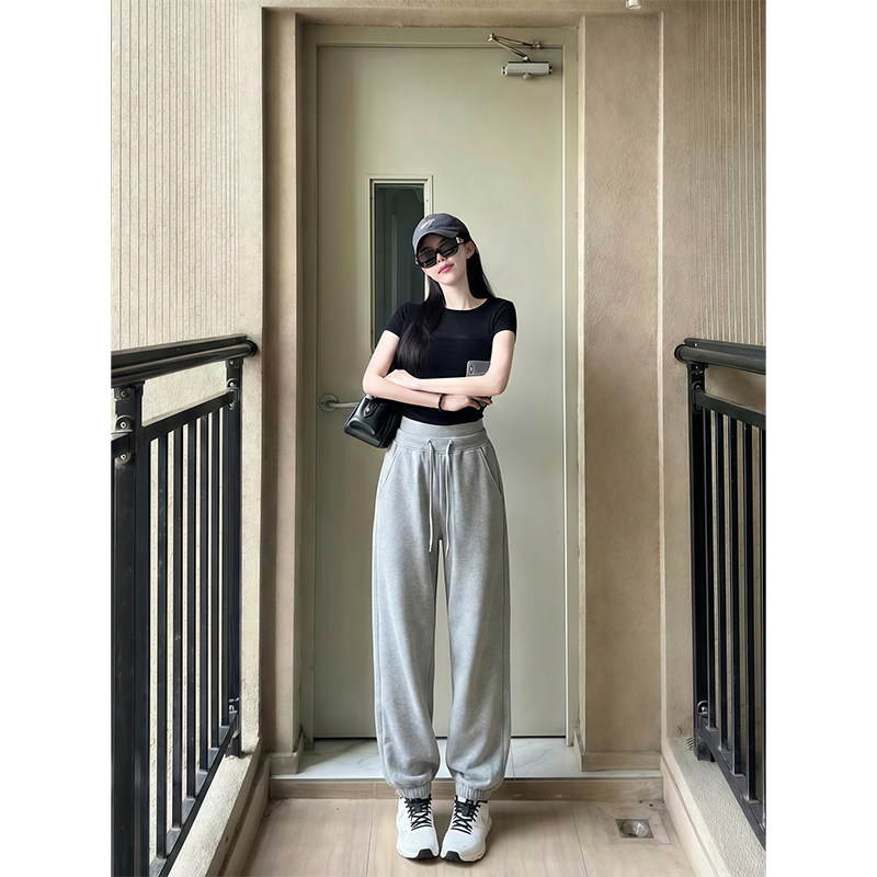 淘白灰色运动裤女秋季小个子直筒阔腿裤条纹宽松bf慵懒风束脚卫裤子
