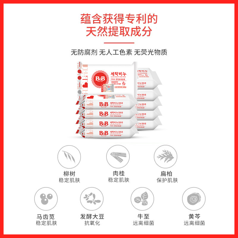 B&B保宁韩国仲夏槐香/晨露菊香宝宝洗衣皂,专为婴幼儿娇嫩肌肤设计,采用天然植物成分,温和无刺激。仲夏槐香型清新淡雅,晨露菊香型自然舒缓,有效去除奶渍、尿渍等顽固污垢,同时呵护衣物纤维。不含荧光剂、漂白剂及有害化学添加,低泡易漂洗,避免残留刺激宝宝肌肤。适用于宝宝衣物、尿布、内衣等贴身织物的手洗或机洗,亦适合敏感肌成人使用。韩国原装进口,品质安心,是家庭洁净护理的理想之选,让宝宝衣物持久洁净柔软,散发自然清香。