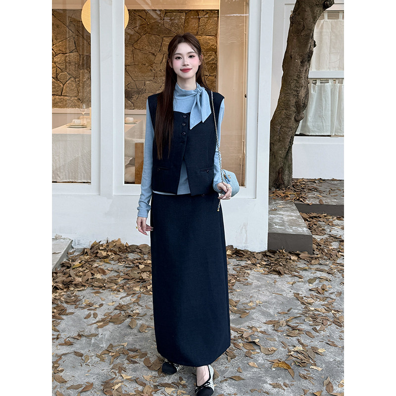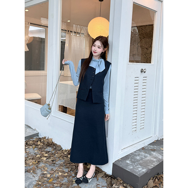淘宝时尚套装高领系带打底衫叠穿马甲女2025秋季新款高腰半身裙三件套