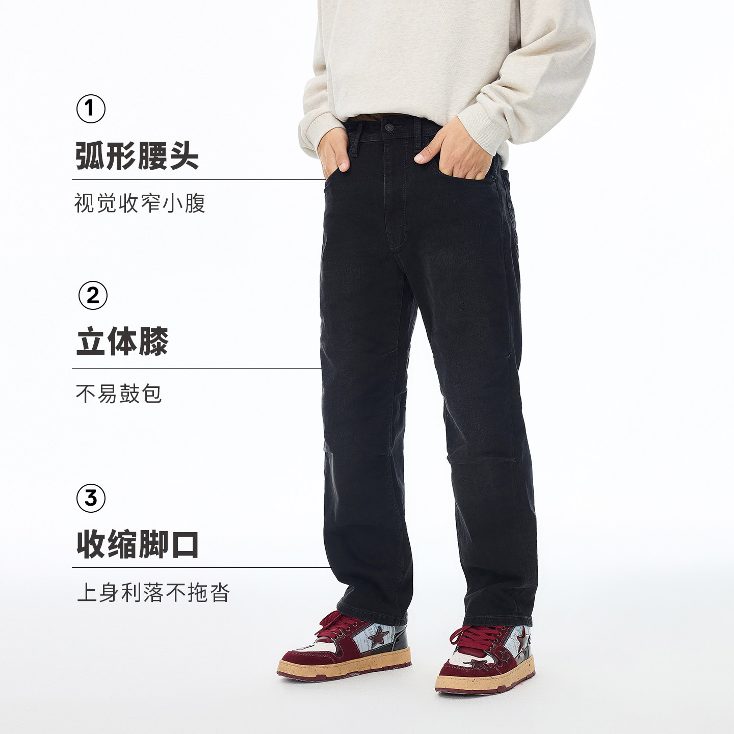 ABLEJEANS【直筒滑板裤】男士百搭休闲长裤,采用经典宽松直筒版型,贴合腿部线条的同时提供自由活动空间,专为街头潮流与日常穿搭设计。精选高弹耐磨牛仔面料,舒适透气,久穿不易变形。简约黑色基调,视觉显瘦,轻松驾驭各种风格。裤身细节考究,加固缝线与金属五金提升耐用性,侧边微落档设计增添慵懒随性感。无论是搭配T恤、卫衣还是夹克,都能轻松打造酷帅休闲造型。适合滑板、出街、通勤等多种场景,是型男衣橱不可或缺的百搭单品。ABLEJEANS,以实用与潮流并重,诠释现代男性不羁态度。