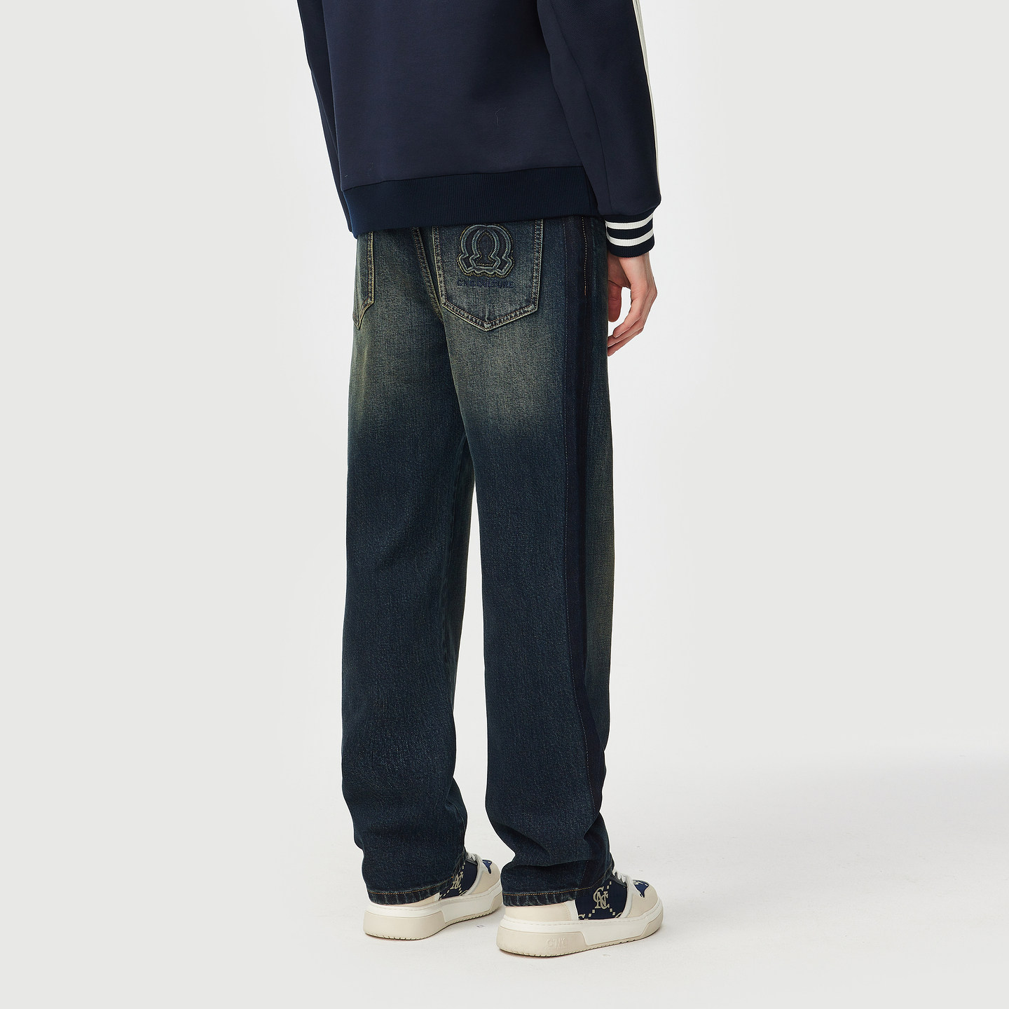 天猫CNC男装25秋新款棉类混纺休闲蓝色男直筒裤口袋大LOGO刺绣牛仔裤