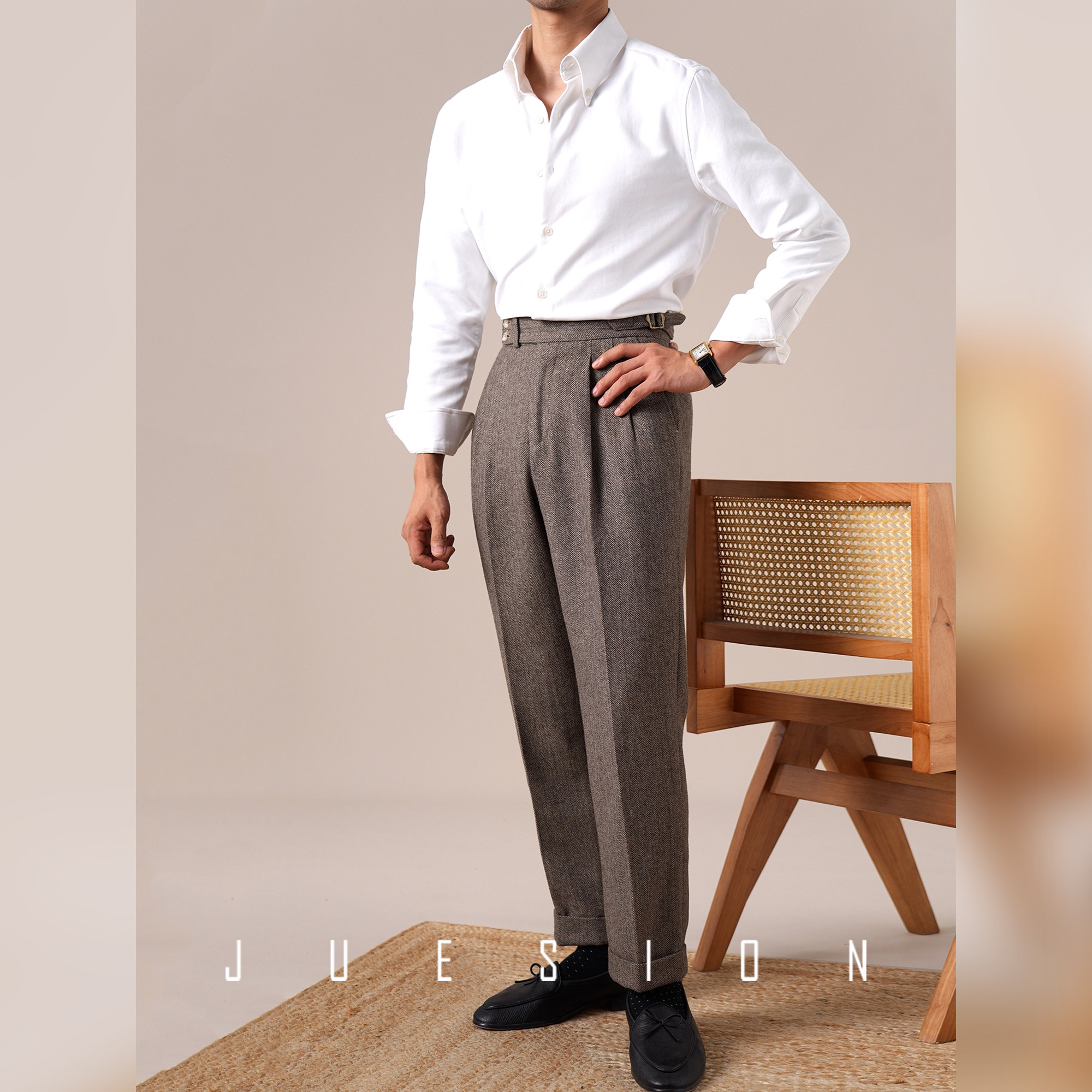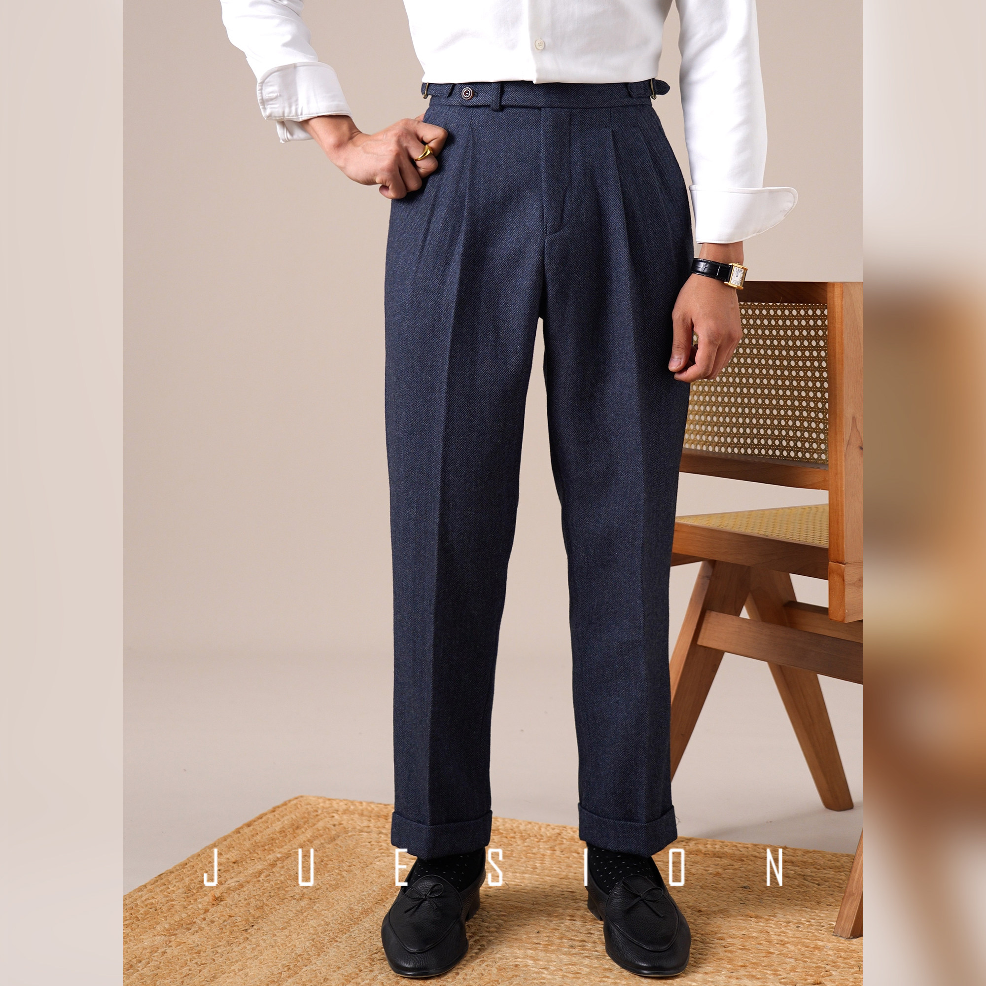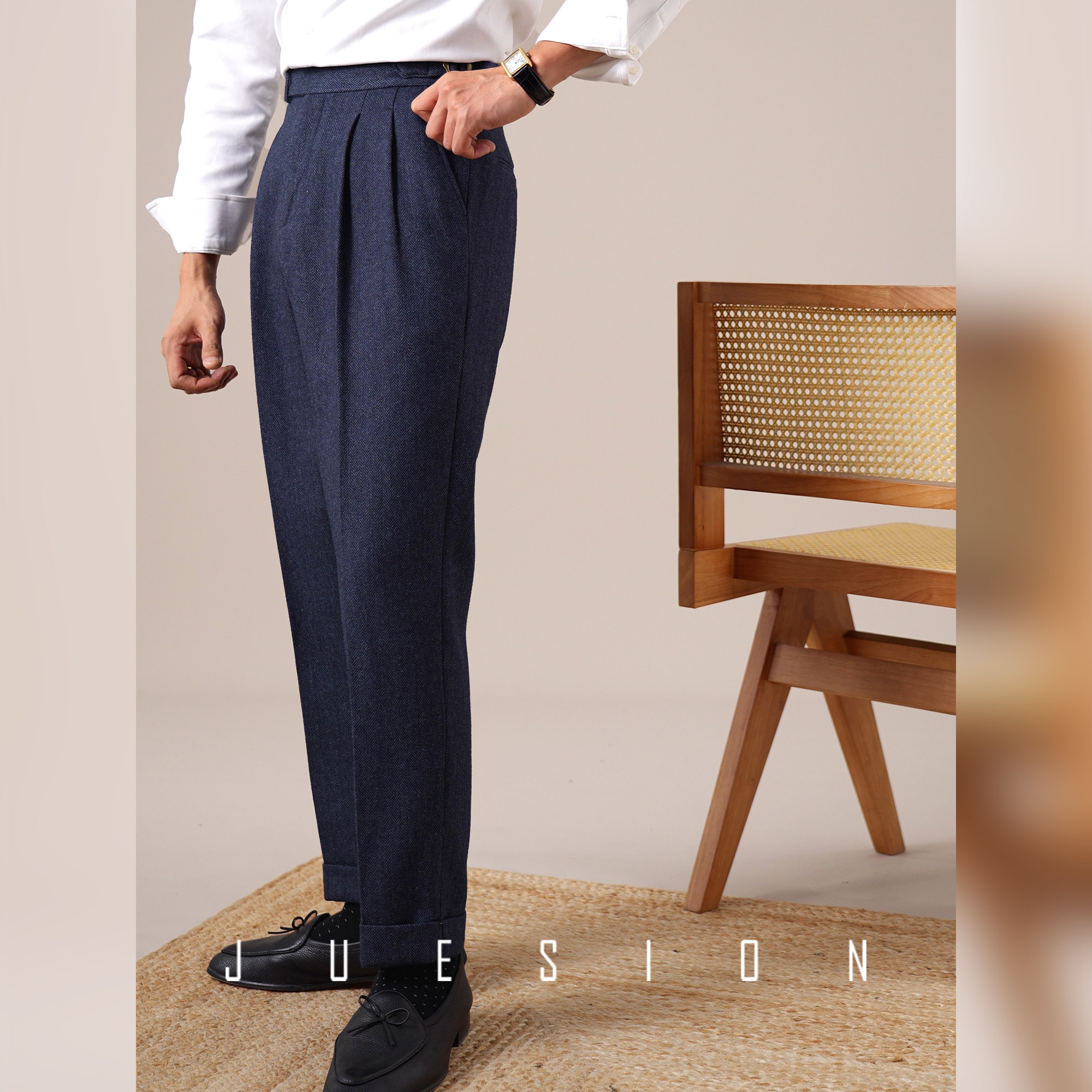 JUESION意式那不勒斯西裤,精选43.3%绵羊毛面料,融合意式精湛剪裁与舒适质感,打造商务休闲两相宜的优雅长裤。高含毛量赋予面料自然垂坠感与细腻光泽,兼具透气性与保暖度,四季皆宜。经典双褶设计提升穿着舒适度,修饰腿型,彰显复古意式格调。高腰剪裁搭配精致手工细节,如真丝里衬与定制纽扣,尽显低调奢华。无论是搭配西装外套出席正式场合,或单配衬衫打造休闲造型,皆能展现男士从容气度。JUESION以匠心工艺,诠释现代绅士的优雅与品位,是衣橱中不可或缺的精品之选。