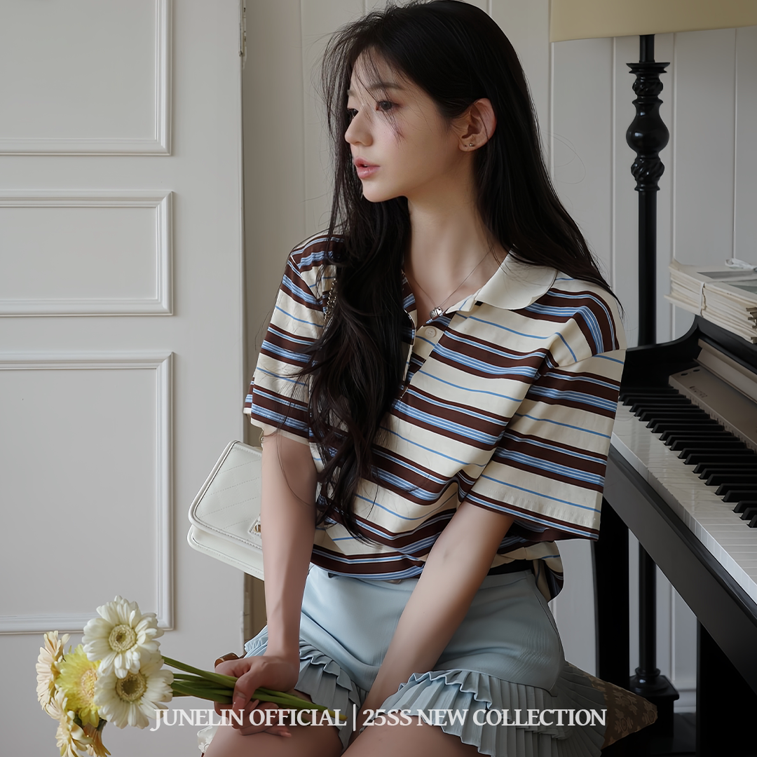 六月林韩国博主同款条纹撞色Polo领T恤女短袖,以清新蓝白撞色条纹为基调,搭配经典Polo领设计,简约中透露着韩系休闲感。衣身采用舒适透气的棉质面料,剪裁合身,短袖设计清爽利落,适合春夏季节日常穿搭。下搭同系列蓝色压褶荷叶边半裙,裙摆灵动飘逸,压褶工艺增添层次与细节感,整体造型甜美又不失知性。整套搭配轻松打造温柔韩系风格,无论是通勤、约会还是出街,都能展现优雅气质与时尚品味,是追求简约时髦女性的理想选择。