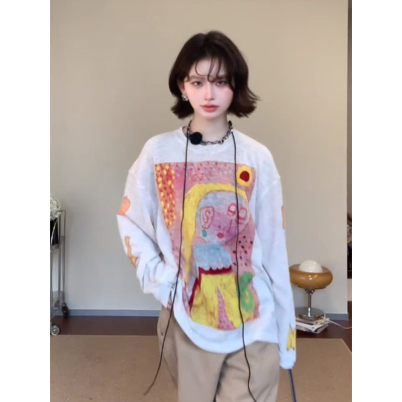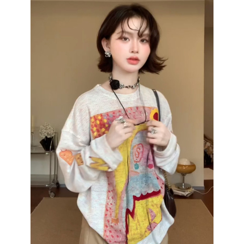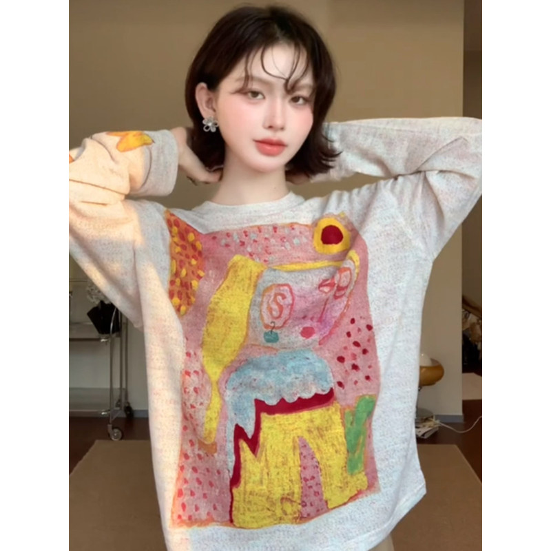 淘宝大码胖mm美式复古趣味涂鸦圆领长袖t恤女秋季休闲宽松百搭上衣女