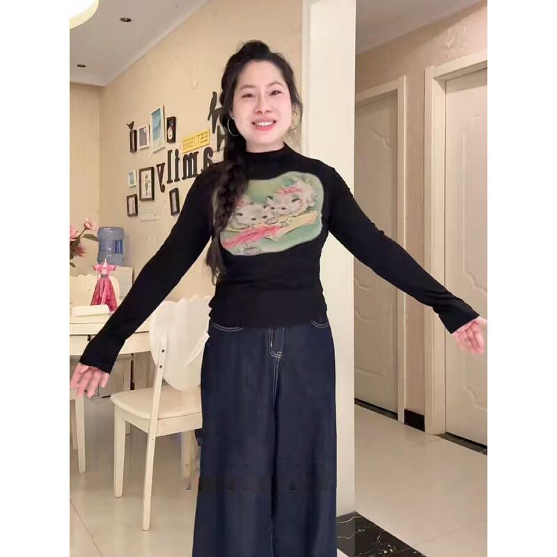 淘宝大码美式纯欲辣妹印花长袖t恤女秋冬胖mm显瘦修身打底衫内搭上衣