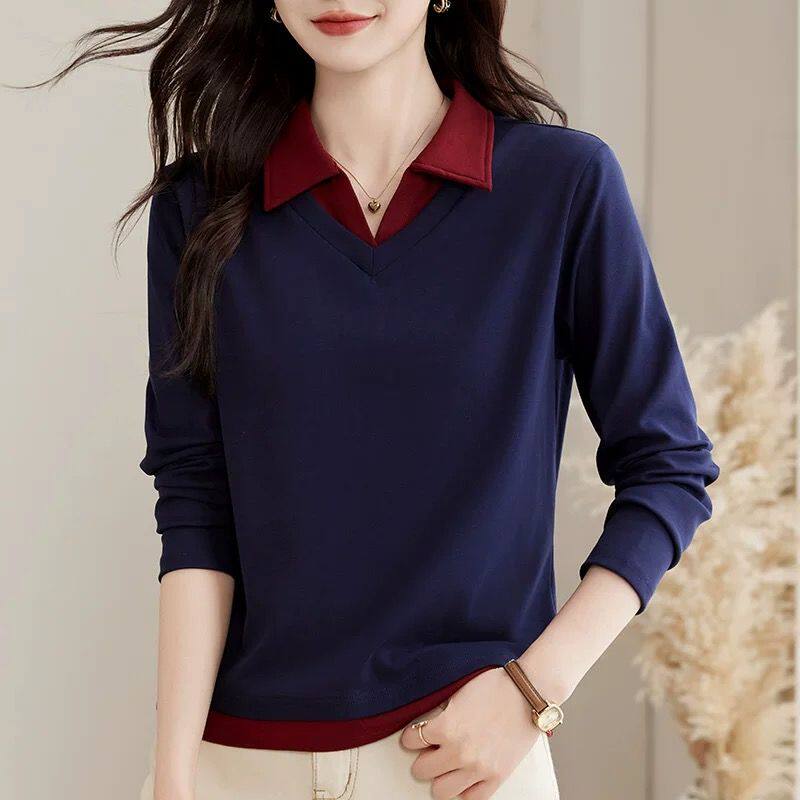 天猫新款翻领显瘦中年妈妈洋气减龄上衣春秋大码polo假两件长袖t恤女