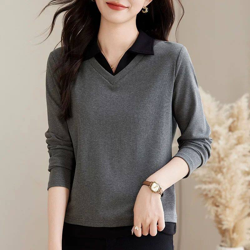 天假两件德绒V领长袖t恤女秋冬2025新款妈妈保暖打底衫大码洋气上衣