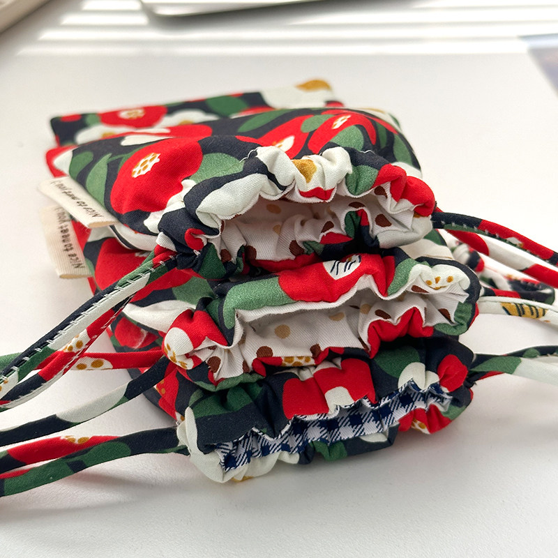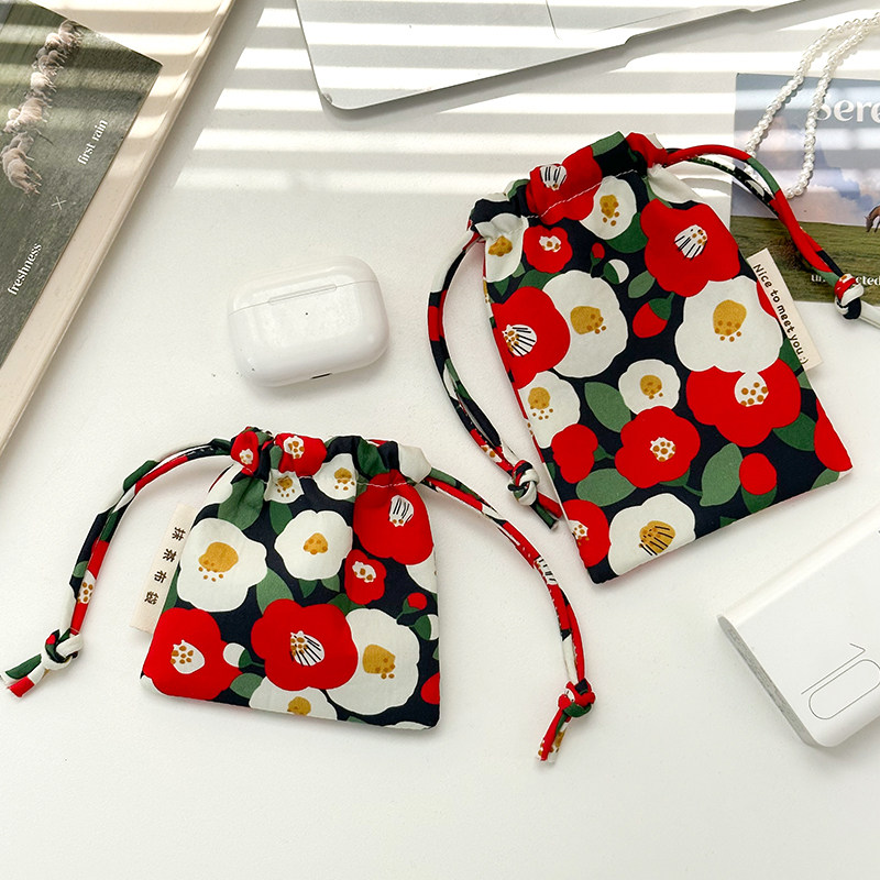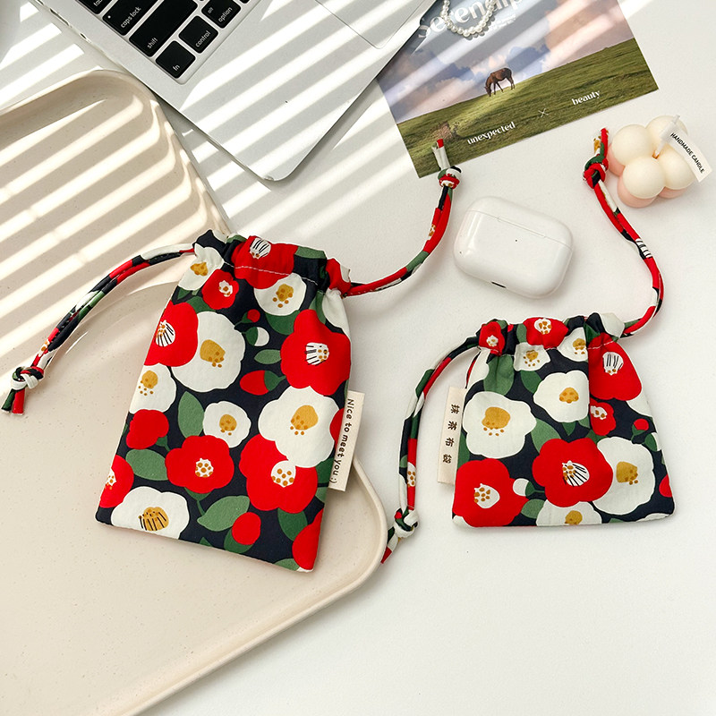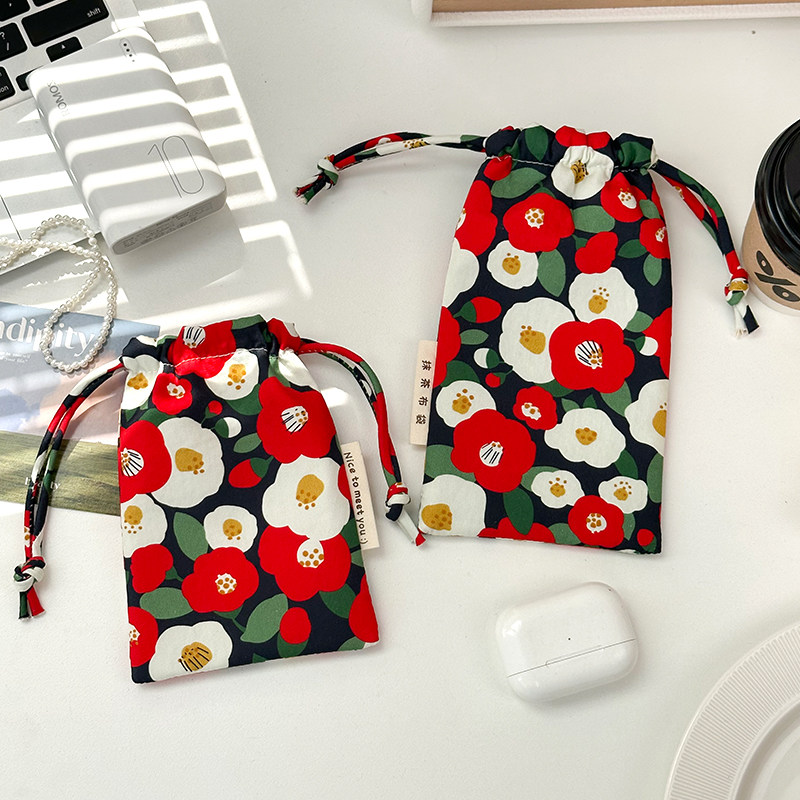 淘宝悦山茶花 中小号束口袋 抽带充电宝收纳袋女棉布小碎花银行卡包