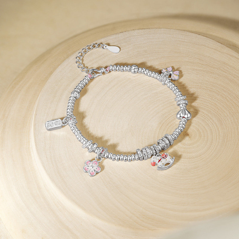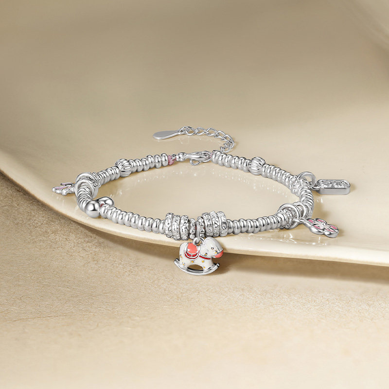 周六福碎银子萌马手链,以S925银精心打造,融合萌趣小马与星尘元素,设计灵动俏皮,细节精致闪耀。手链采用碎银子工艺,光泽柔和细腻,佩戴轻盈舒适,尽显女性温婉气质。萌马造型象征好运与守护,星尘点缀如夜空微光,浪漫梦幻,寓意美好祝愿。无论是日常搭配还是特殊场合,都能为造型增添亮点。作为情人节礼物,它不仅传递爱意与心意,更承载专属的浪漫记忆。周六福匠心工艺,品质保障,是送女友、表达心意的贴心之选,让爱在腕间闪耀,情意绵长。