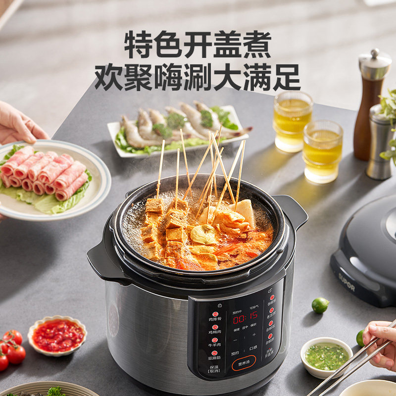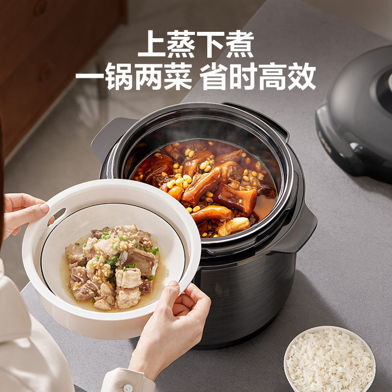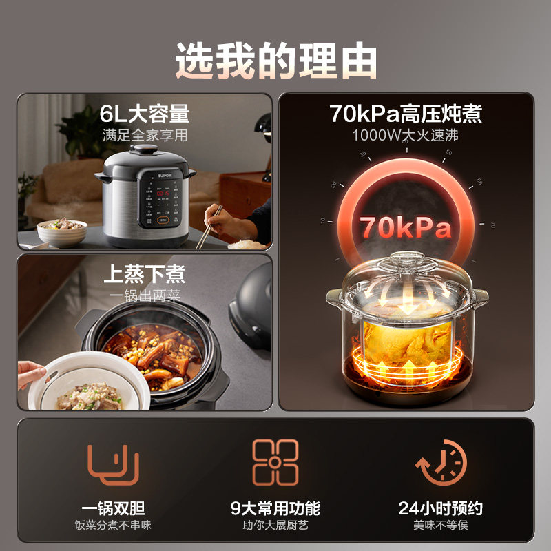 苏泊尔2024新款家用6L大容量电压力锅,采用双胆设计,配备精钢厚釜和铝合金蒸胆,满足炖煮、蒸煮、焖饭等多种烹饪需求。全自动智能控制,内置多种预设菜单,一键操作轻松搞定美味。高压快煮技术大幅缩短烹饪时间,锁住食材营养与鲜香。6L大容量适合3-6人家庭使用,聚会待客更从容。配备安全阀、限压保护及开合盖检测等多重安全设计,使用更安心。易清洁不粘内胆,打理省心。简约时尚外观,适配现代厨房。集高效、安全、多功能于一体,是家庭厨房的理想之选。