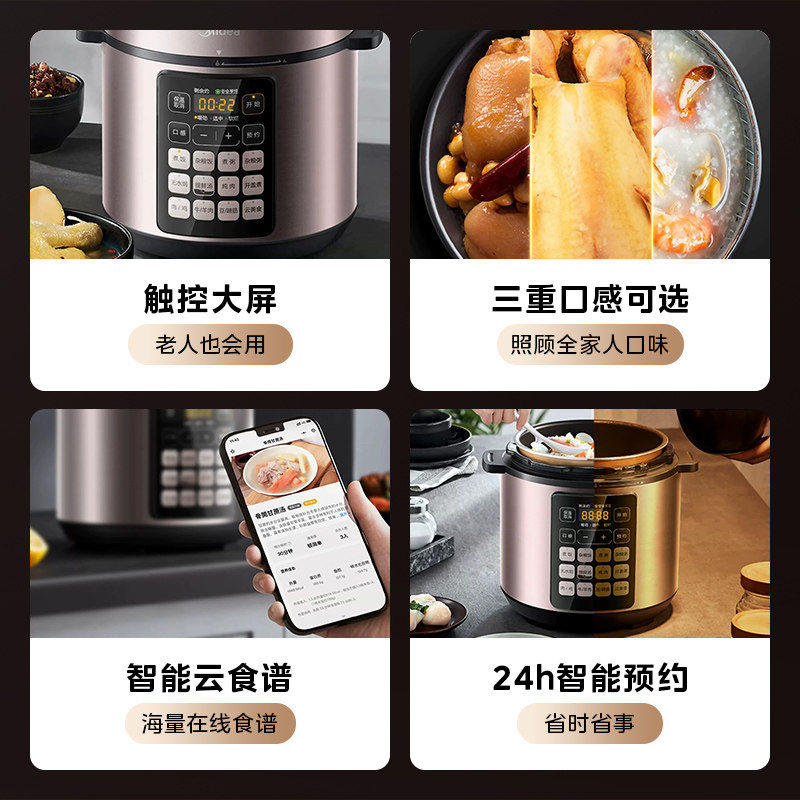 天美的电压力锅家用6L大容量0涂层钢胆高压锅电饭煲正品官方旗舰店
