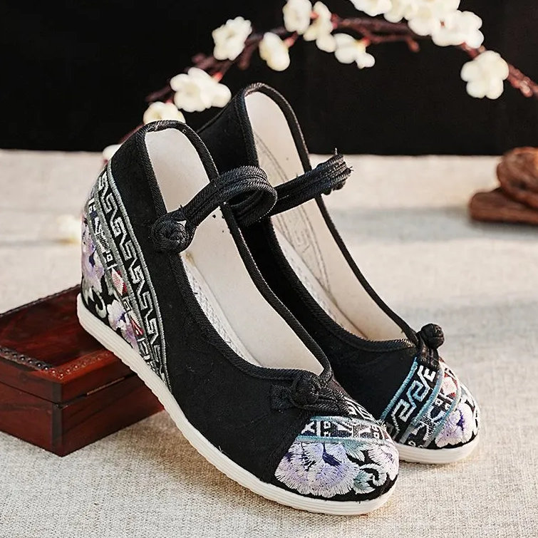 老北京坡跟布鞋内增高民族风绣花汉服鞋舞蹈鞋浅口圆头妈妈单鞋夏