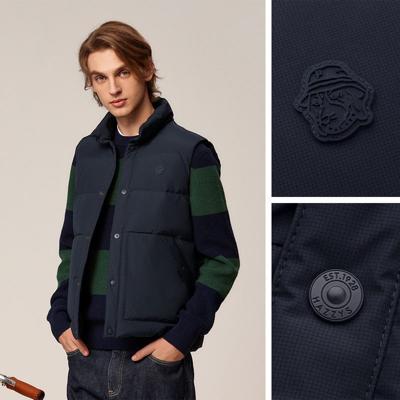 Hazzys哈吉斯冬季男士羽绒马甲,以简约立领设计融合英伦休闲风格,兼顾时尚与实用。精选高品质白鸭绒填充,轻盈保暖,有效锁温,适合秋冬季节叠穿或单穿。立体剪裁贴合身形,活动自如不束缚,搭配可拆卸内胆设计,满足不同温度需求。外层采用防风防泼水面料,耐磨易打理,细节处彰显品牌精致工艺。无论是通勤、户外还是日常休闲,这款羽绒马甲都能轻松驾驭,为男士穿搭增添层次感与温暖体验,是冬日衣橱的必备单品。