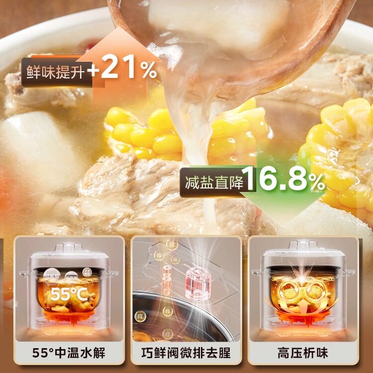 美的0氟5L电压力锅,家用大容量智能高压锅,官方正品保障。采用创新0氟涂层内胆,健康安全,耐高温、抗刮耐磨,久用不粘。5L大容量设计,满足3-6人家庭需求,炖汤、煮饭、焖肉一锅搞定。智能控压系统精准调节压力,食材软烂入味,营养不流失。配备多重安全保护,包括防干烧、超压自泄和开合盖检测,使用更安心。一键操作,多种预设菜单,轻松烹饪美味。外观简约时尚,易清洁设计,是现代厨房的理想之选。美的品质,值得信赖。