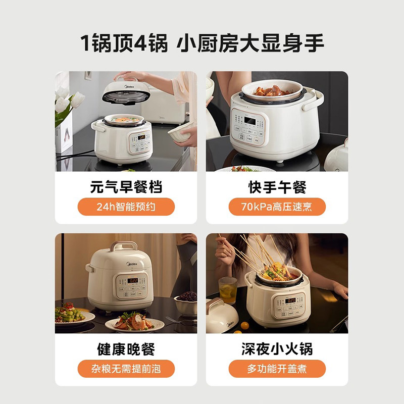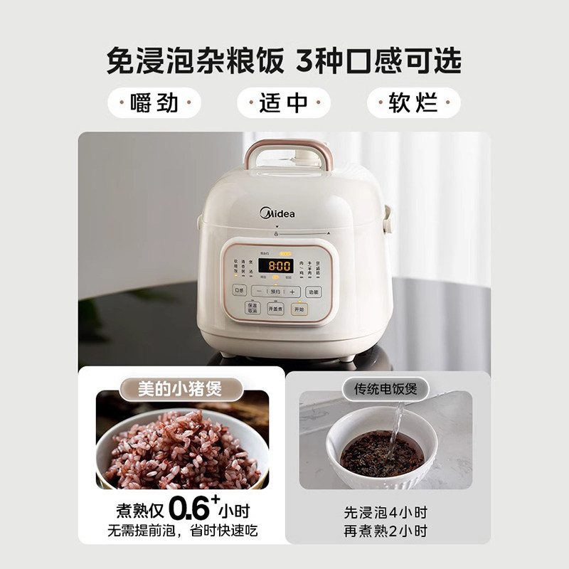 美的1.8升小型电压力锅,专为1-3人家庭设计,体积小巧却不失高效性能。采用智能控压技术,快速升压锁鲜,烹饪更省时省电。内胆为不粘涂层材质,受热均匀,易清洗,支持煮饭、煲汤、炖肉、蒸菜等多种功能,一锅多用。配备安全防溢阀与多重保护机制,使用更安心。操作界面简洁直观,一键启动,老人也能轻松上手。无论是单身公寓、学生宿舍还是小家庭日常使用,这款迷你电压力锅都能满足多样化烹饪需求,让美味触手可及,是厨房中的实用好帮手。