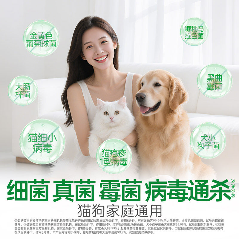 Dettol滴露宠物家庭专用除菌除臭喷雾,专为养宠家庭设计,有效杀灭99.99%的常见细菌,守护人宠共居环境的健康安全。适用于猫砂盆、狗尿垫、宠物窝垫、笼具及周围区域,快速分解异味分子,持久清新空气。配方温和不刺激,对宠物友好,使用后无需冲洗,方便快捷。300ml便携装设计,居家或外出均可轻松携带。滴露品牌信赖保障,科学除菌更安心,让宠物生活空间洁净无忧,为爱宠和家人营造健康舒适的生活环境。定期使用,有效预防细菌滋生,是养宠家庭的理想清洁伴侣。