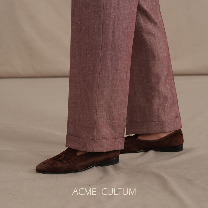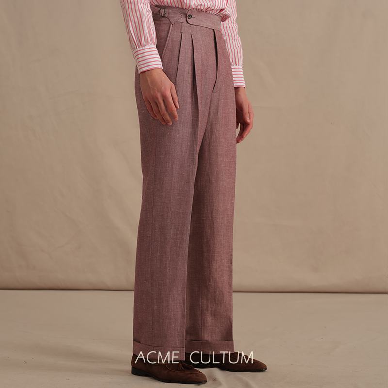 【轻透毛麻】AC定织暗纹透气偏色高腰双褶直筒那不勒斯西裤,精选优质毛麻混纺面料,质地轻盈透气,兼具天然纤维的舒适感与垂坠性。独特AC定织工艺呈现低调暗纹,搭配匠心偏色处理,赋予裤装层次丰富的视觉质感。高腰双褶设计致敬经典那不勒斯剪裁,修饰腿型,提升穿着优雅度;直筒廓形利落大方,适配多种场合。无论是商务休闲还是都市通勤,皆能展现从容格调。细节处精工细作,腰头内里包边、隐形拉链与手工缝制扣眼,彰显品质追求。一条融合传统工艺与现代审美的男士长裤,诠释低调奢华的意式风范。