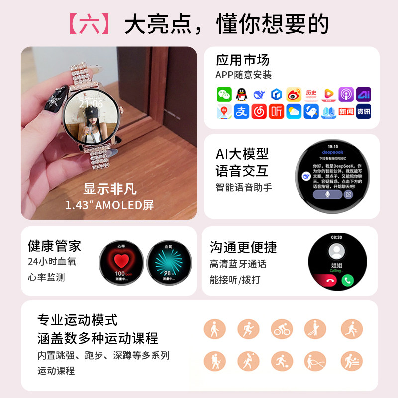 【女神专属】高精度血压血糖风险评估智能手表心电心率蓝牙通话运动监测心率血氧生理期智能手环送女友送老婆