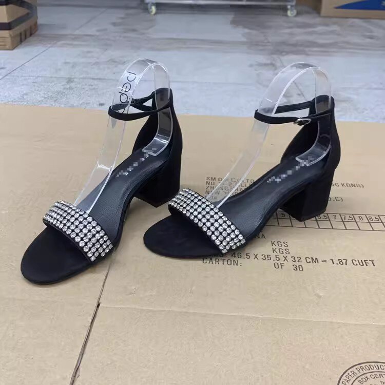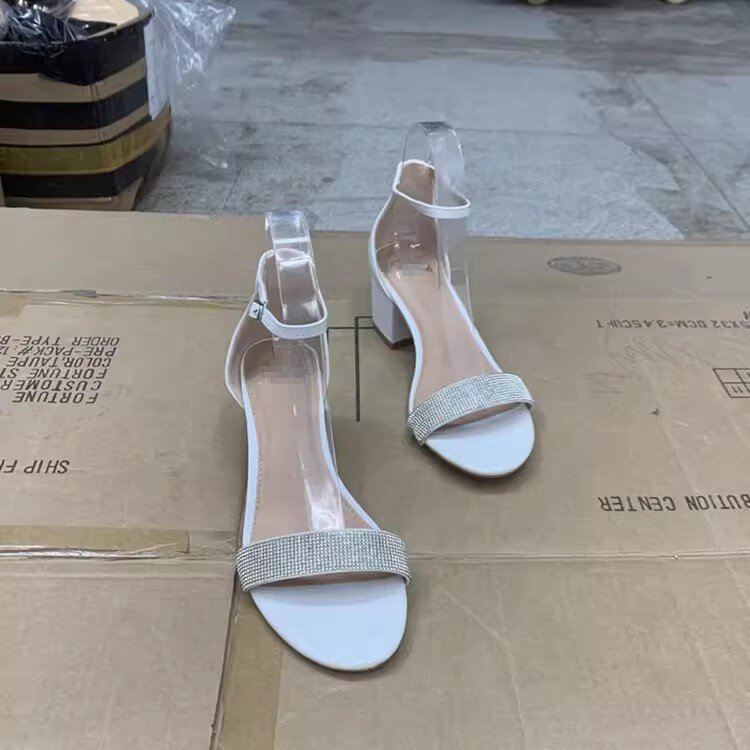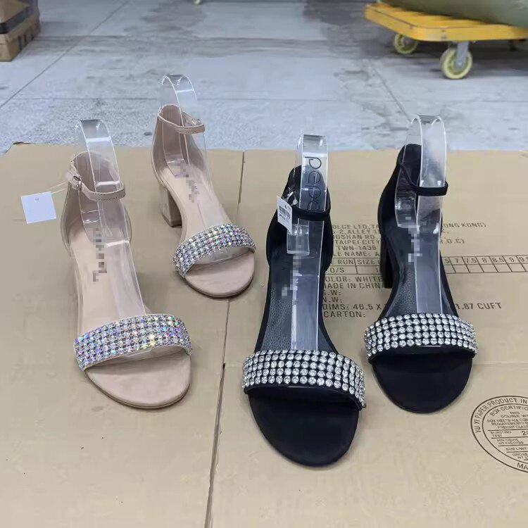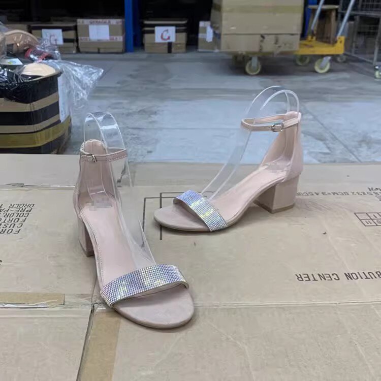 淘宝外贸女鞋原单时尚简约欧美闪钻一字带粗高跟露趾凉鞋