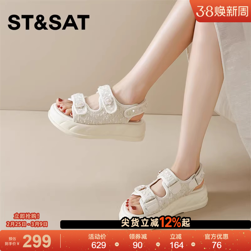 天猫星期六一字带凉鞋女新款夏外穿珍珠花朵厚底懒人魔术贴沙滩鞋