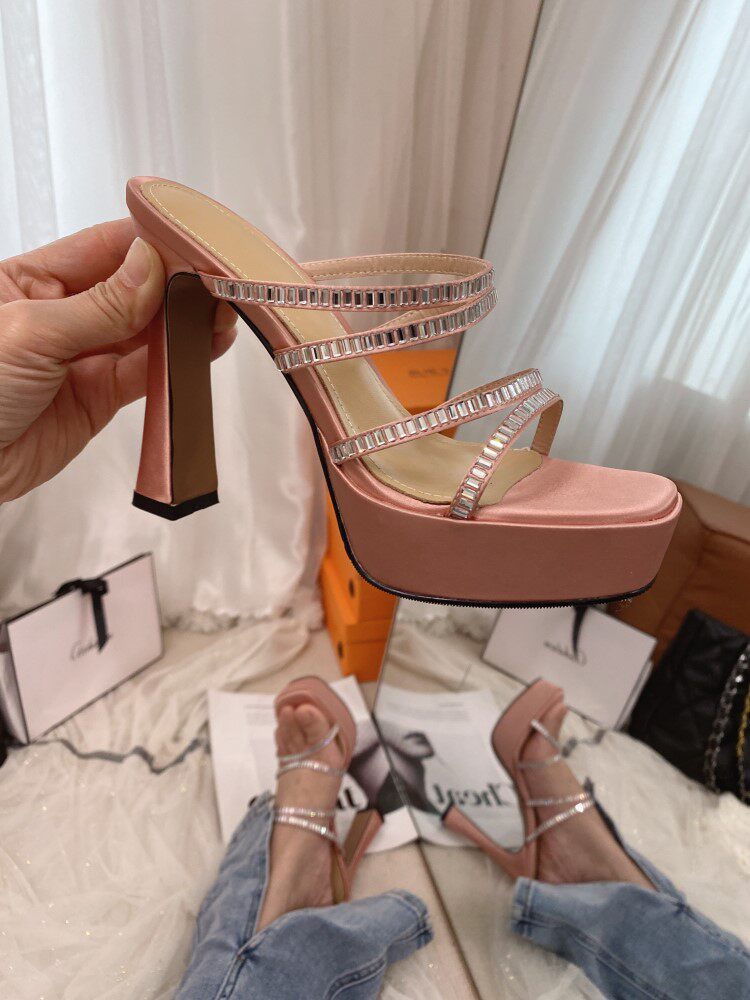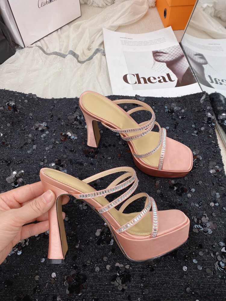 淘宝2024年小个子高跟真丝绸缎粗高跟水钻凉鞋防水台舒适百搭一字拖鞋