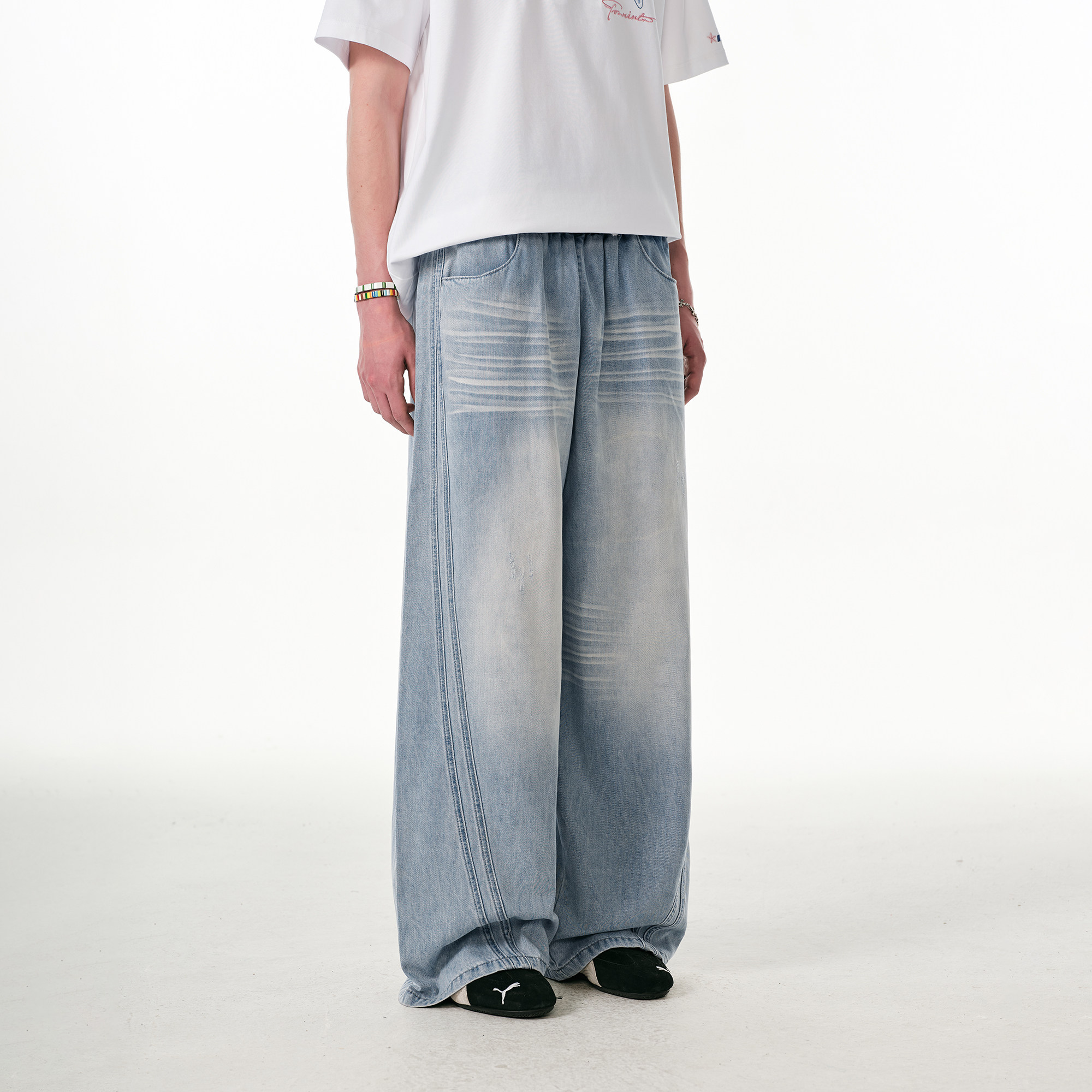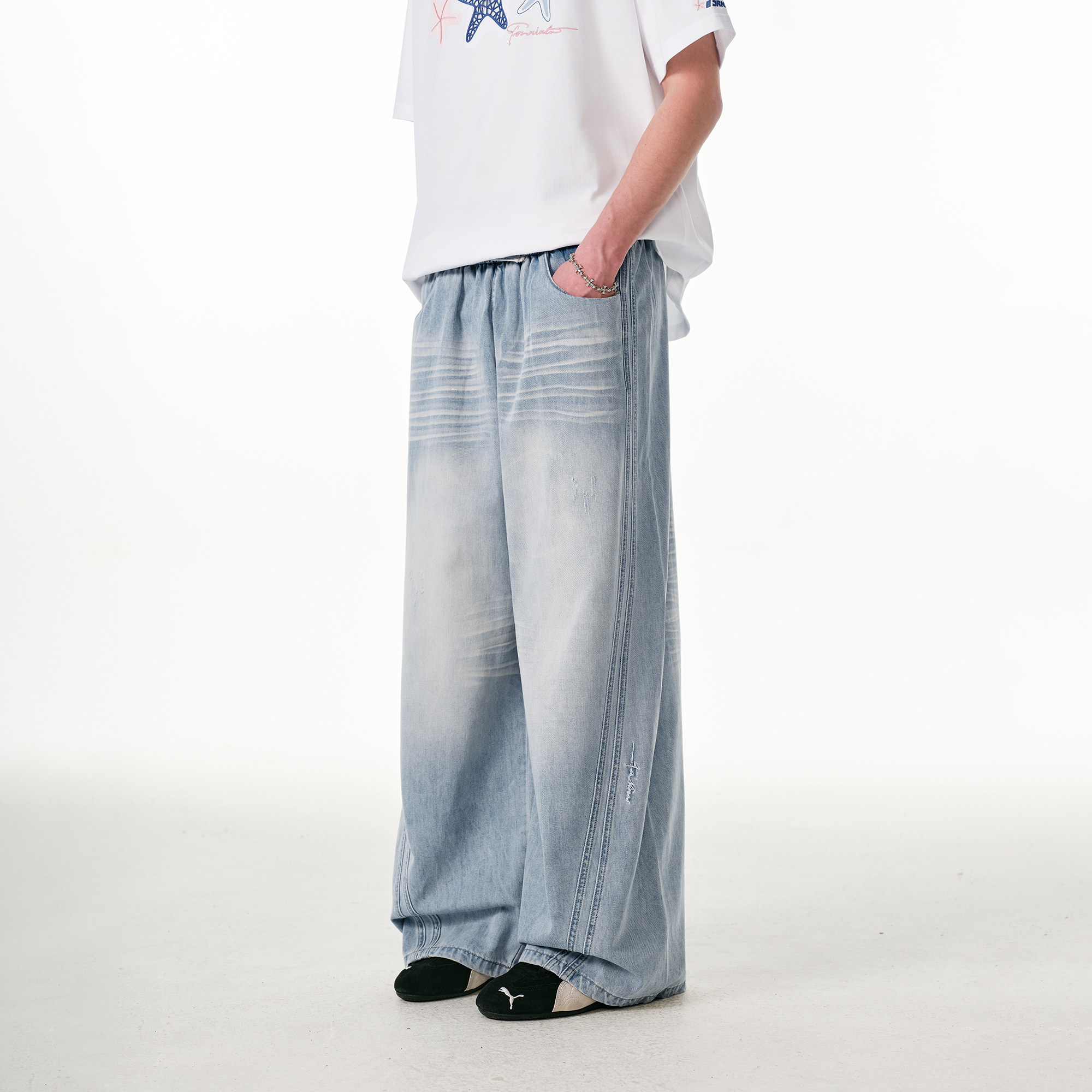 悟空有货潮牌美式星星刺绣丹宁直筒牛仔裤男宽松潮流阔腿百搭长裤