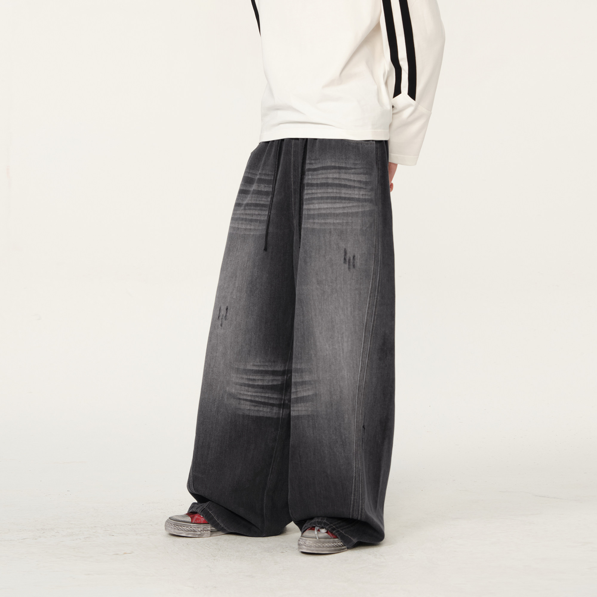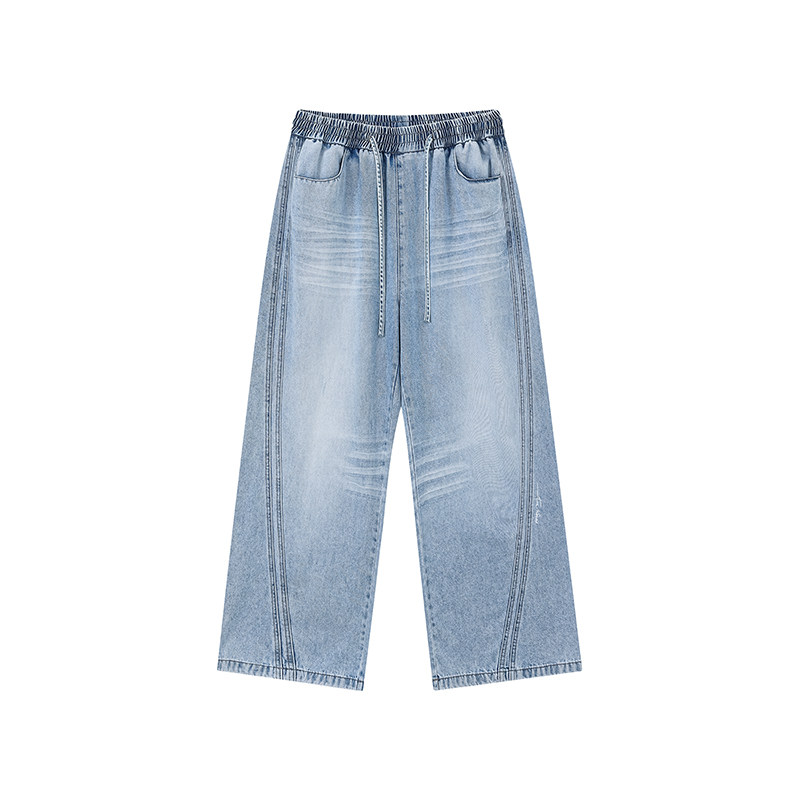 上班干活穿的裤子男士耐磨耐脏牛仔裤松紧腰宽松直筒阔腿休闲长裤