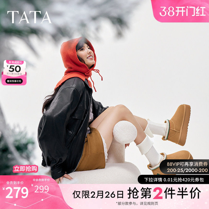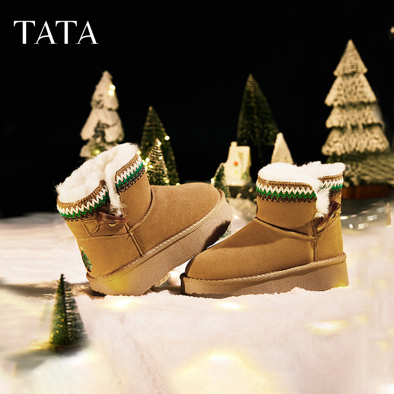 天猫TATA他她新年靴加绒保暖雪地靴女靴厚底毛毛棉鞋短靴冬CDD03DD4